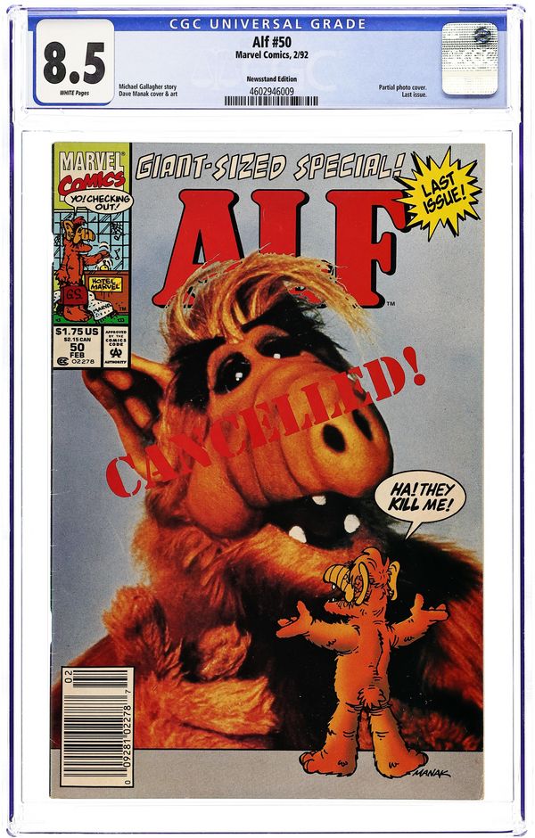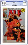 Newsstand Edition. Comic book version of the TV sitcom and cartoon that aired on NBC from 1986 to 1990 featuring an Alien Life Form (ALF) living with a family. The countdown concludes for the final issue of ALF with Part 4 of "Th – Th – Th That's ALF, Folks – ALF Weidersehn" in which a Melmac wedding takes place and then the alien task force closes in on ALF. Or do they? Find out what happens to ALF and the Tanners in this double-size series-ending issue. Then ALF convinces the editors at Marvel Comics to do a biographical data profile page on him for the Marvel universe in "Universal Acceptance." And in "And Now, Ladies and Gentlemen…One Last Time…Heeeeeeeeeeere's ALF," our favorite furry alien shows the past and future with the Tanners in a talk-show style setting. Scripts by Michael Gallagher and art by Dave Manak & Marie Severin. Issue also has a double-page special final issue pinup. Cover price $1.75. Grade: CGC 8.5 explanation of grade Condition: Used (collectible)