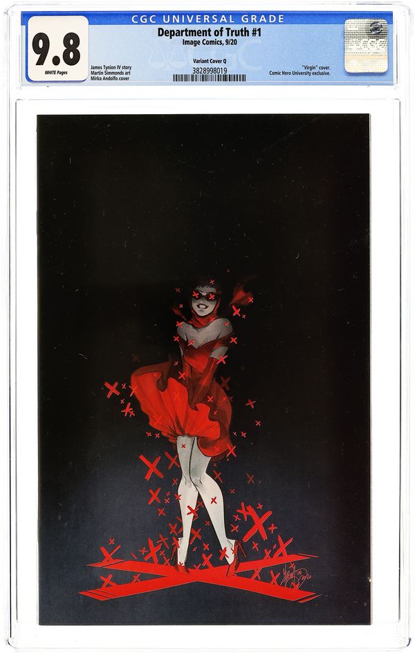 Ended Nov 10 7:59 PM CST Bid History 13 bids Winning Bid $57 Comic Hero University Exclusive Virgin Cover by Mirka Andolfo. Written by James Tynion IV. Art by Martin Simmonds. SERIES PREMIERE! Cole Turner has studied conspiracy theories all his life, but he isn't prepared for what happens when he discovers that all of them are true, from the JFK assassination to flat Earth theory and reptilian shapeshifters. One organization has been covering them up for generations. What is the deep, dark secret behind the Department of Truth? 32 pages, full color. Rated M Cover price $3.99. Grade: CGC 9.8 explanation of grade Condition: Used (collectible)