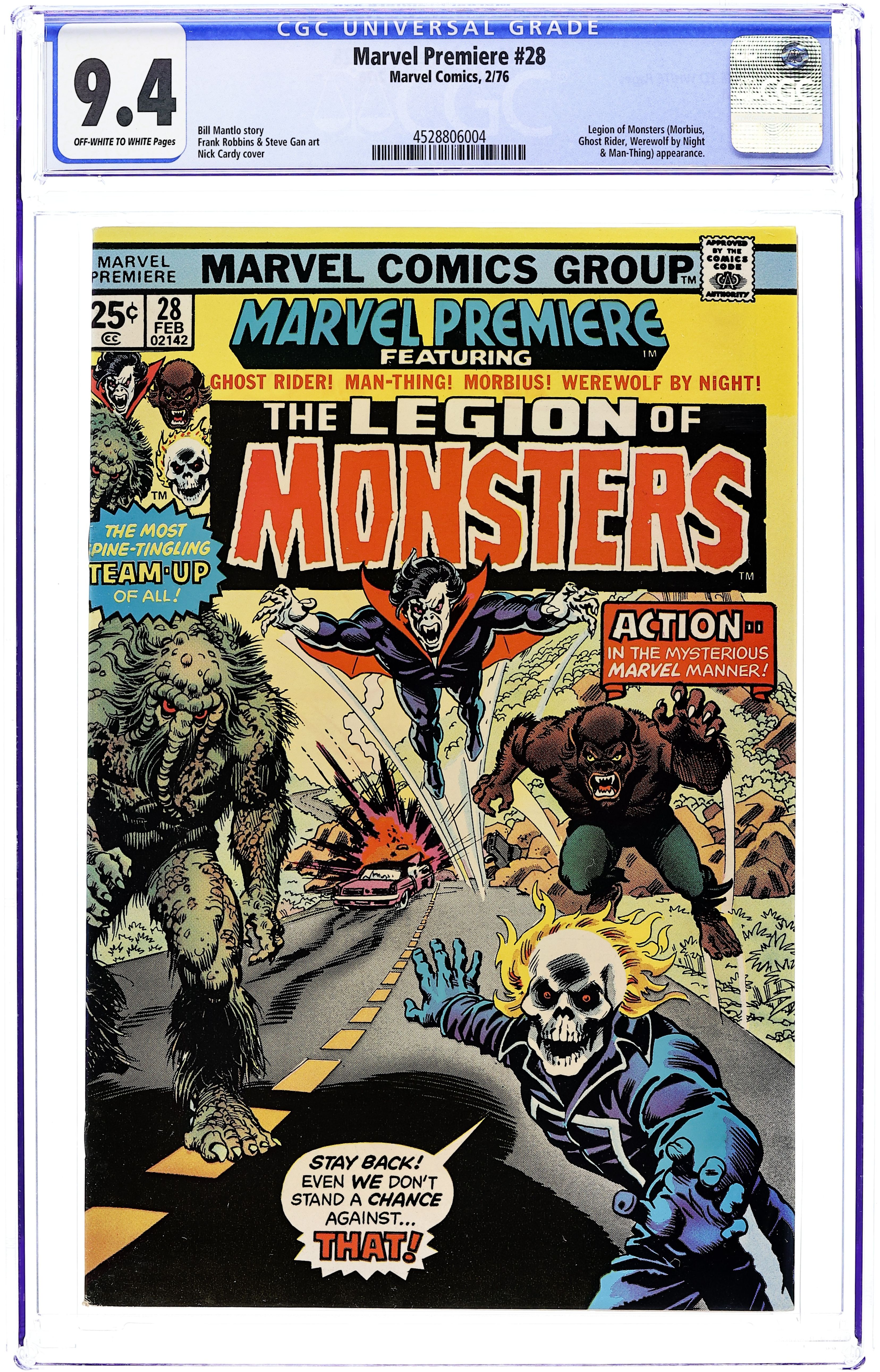 The Legion of Monsters - Starring Ghost Rider, Morbius, Werewolf by Night and Man-Thing - "There's a Mountain on Sunset Boulevard!" Written by Bill Mantlo. Art by Frank Robbins and Steve Gan. The mightiest monsters of the Marvel Universe stand united! But can even their combined macabre might stand up to the supernatural power of the Starseed?! 32 pages, FC. NOTE: Letter to the editor from writer Frank Lovece. Cover price $0.25. Grade: CGC 9.4 explanation of grade Condition: Used (collectible)