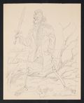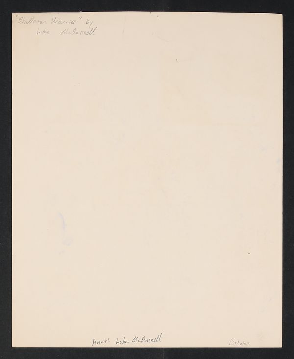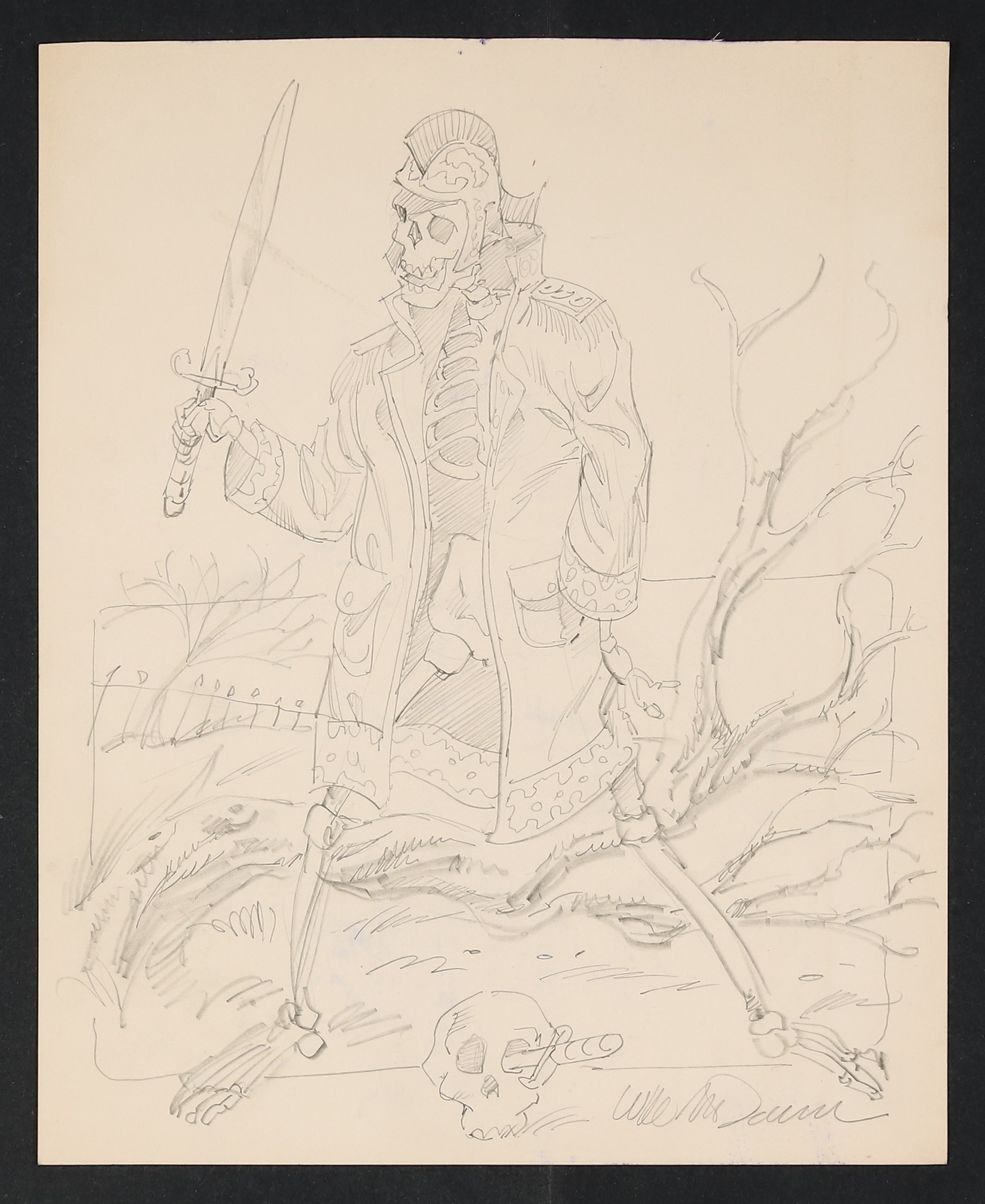 A lively sketch, McDonnell puts a nice twist on the classic trope of the skeleton warrior with a high-collared jacket that brings the design out of the fantasy realm and into a grungier, possibly post-apocalyptic kind of setting. Signed by the artist. Pencil on art board. 11" x 13 1/2".