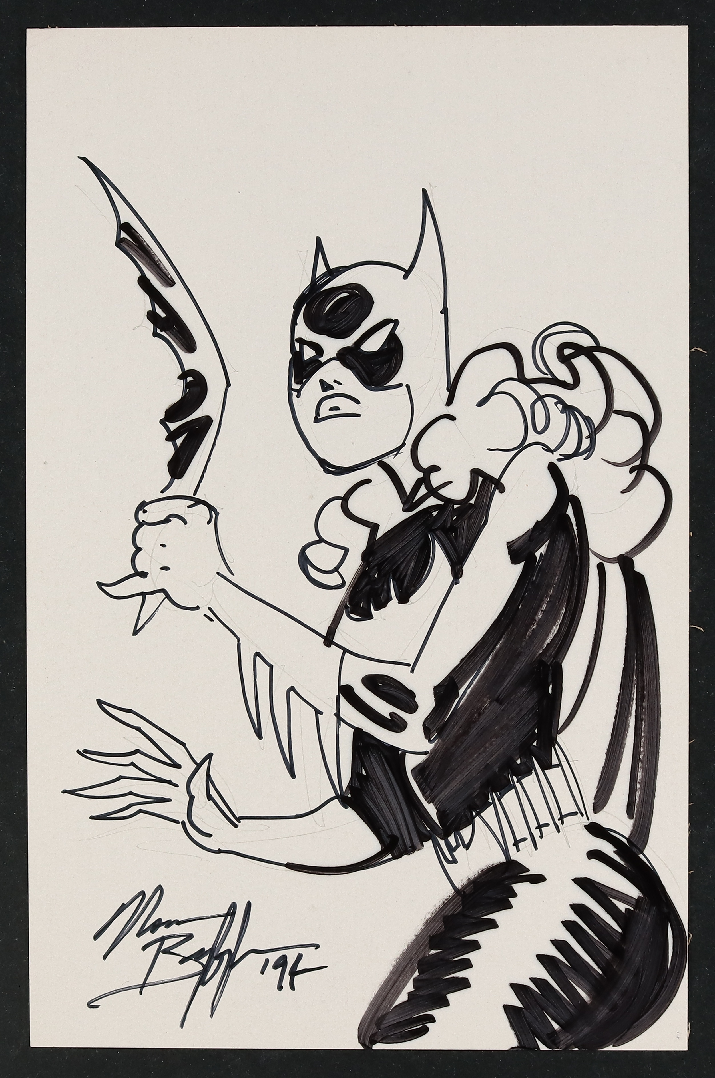One of the most legendary Bat-artists to ever do it turns in a great sketch of Babs in an action-ready pose! Signed by the artist. Pencil and ink on backing board. 6 3/4" x 10 1/2".