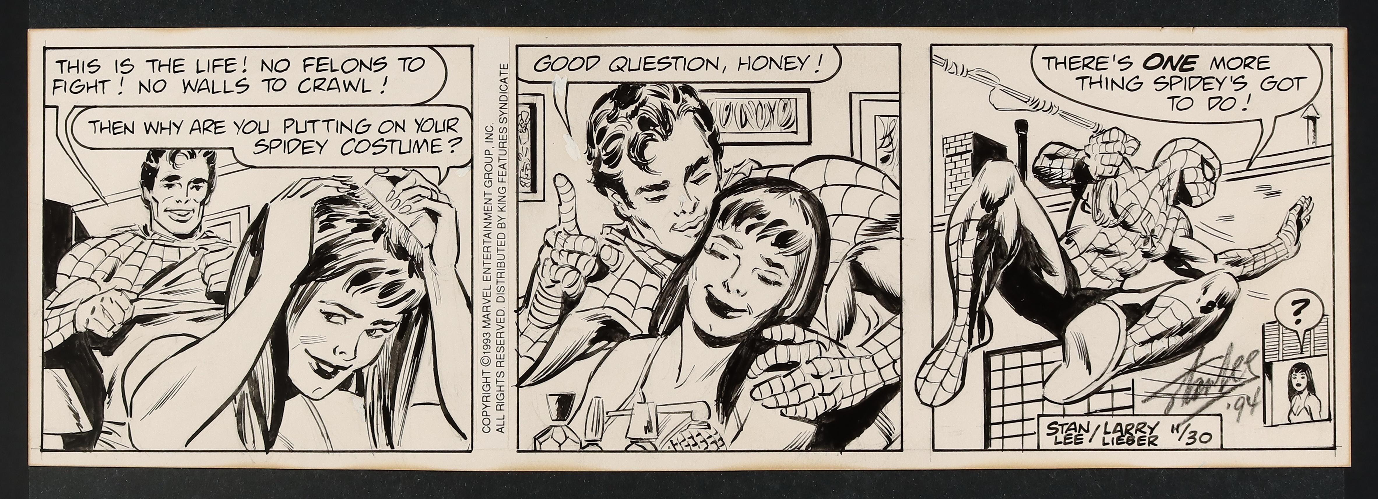You couldn't ask for a better Spidey strip! After a sweet moment with MJ, Spidey swings into action in a great final panel. Signed by Stan Lee in third panel. Pencil and ink on art board. 13 1/4" x 4 1/2".