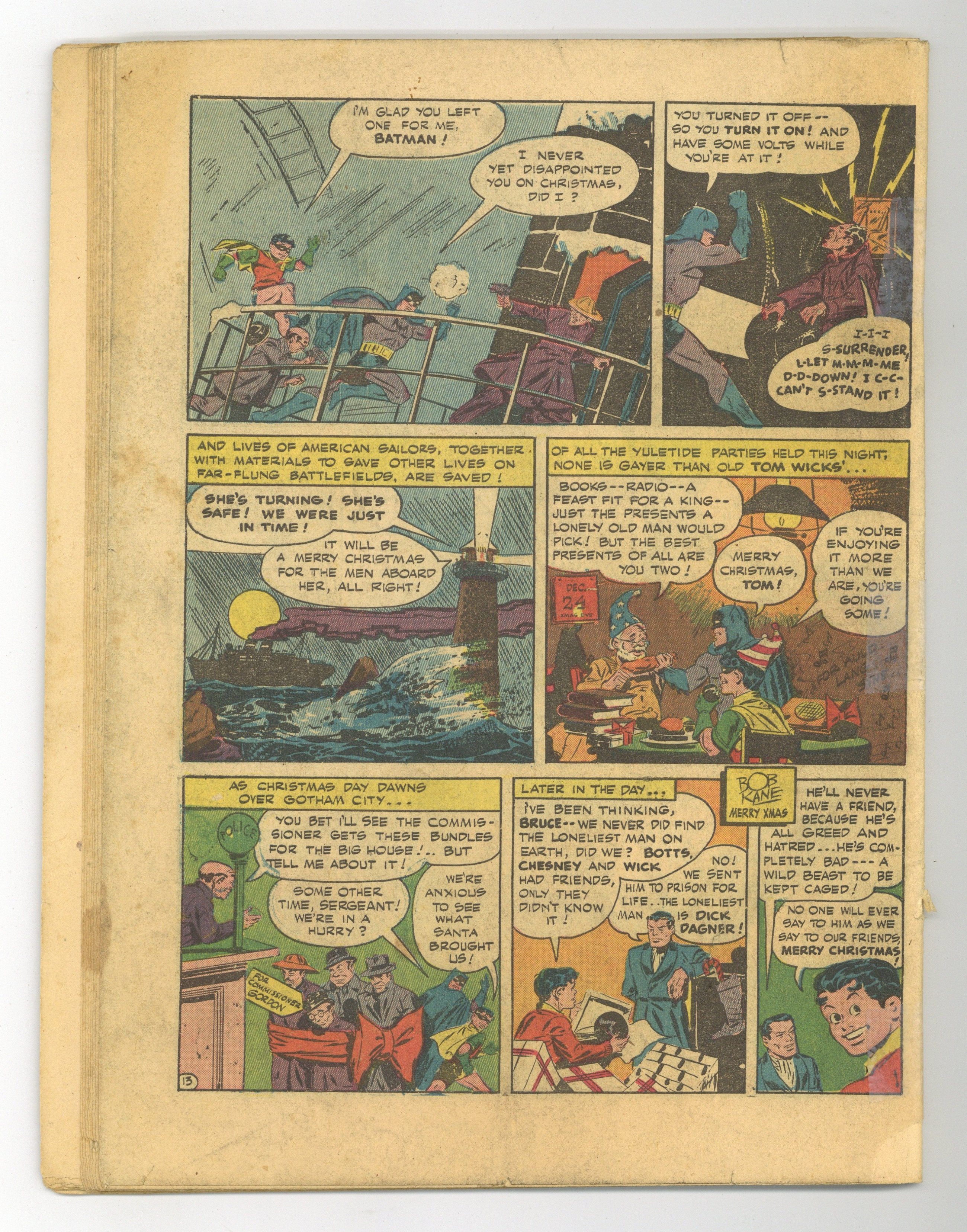 Ended Oct 13 2025 Bid History 13 bids Winning Bid $76 Cover by Jack Burnley. "Your Face Is Your Fortune!", script by Jack Schiff, pencils by Bob Kane, inks by Jerry Robinson and George Roussos; Selina Kyle wins a beauty contest under an assumed name and falls in love with Bruce Wayne, who was one of the judges. 2-page Lucky-Bucky story by Bob Naylor. "The Boy Who Wanted to Be Robin!", script by Don Cameron, pencils by Jack Burnley, inks by Jack Burnley and Ray Burnley (backgrounds); After watching the Caped Crusader's in action for a period of time, and especially Robin, a criminal boss decides that he will use Batman's methods against him and adopts a youngster to aid him. "The Two Futures," script by Bill Finger, pencils by Jack Burnley, inks by Jack Burnley and Ray Burnley (backgrounds); The Caped Crusaders visit the world's greatest historian, whose fellow professors give them an idea what will happen to America's democratic way of life when the war ends. "A Lucky Break" text story by Dan Darcy. One-page Shorty story by Henry Boltinoff. "The Loneliest Men in the World," script by Don Cameron, pencils by Bob Kane, inks by Jerry Robinson and George Roussos (backgrounds); For this Christmas, Batman and Robin decide to play Santa to "the loneliest men in the world": those who have no friends at that festive time of the year. 68 Pages, Full Color. Cover price $0.10. Grade: Coverless explanation of grade Condition: Used (collectible)