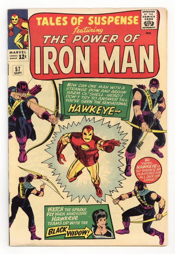 Starts Jan 3 Cover by Don Heck. First appearance of Hawkeye in "Hawkeye, the Marksman!", script by Stan Lee, art by Don Heck; A carnival marksman tries to become a super-hero, but after a misunderstanding with the police he falls in with the Black Widow; Hawkeye attacks Iron Man at the Widow's request, but when he accidentally injures his partner in the fight he flees to get her to safety. "The Runner" text story. "The Watcher's Power!", script by Stan Lee (plot) and Larry Lieber (script), pencils by Larry Lieber, inks by George Roussos (as George Bell); Space Pirates plan to attack a rich planet, thinking the Watcher will not interfere; They are destroyed because they unknowingly targeted the Watcher's home world, the one planet that he can interfere with. 36 pages, full color. Cover price $0.12. Grade: FN+ 6.5 explanation of grade Condition: Used (collectible)