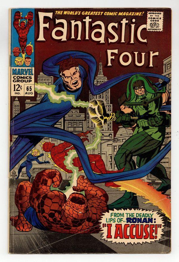 Cover pencils by Jack Kirby, inks by Joe Sinnott. ...From Beyond This Planet Earth!, script by Stan Lee and Jack Kirby (co-plot), pencils by Jack Kirby, inks by Joe Sinnott; Ronan the Accuser is dispatched to Earth by the Kree Supreme Intelligence to try the FF for the destruction of the Kree Sentry; The FF resist Ronan and defeat him. Silver Surfer cameo (a sculpture). Crystal (of the Inhumans) guest appearance. Reprinted in Marvel's Greatest Comics # 48. 36 pgs. $0.12. Cover price $0.12. Grade: VG 4.0 explanation of grade Condition: Used (collectible)