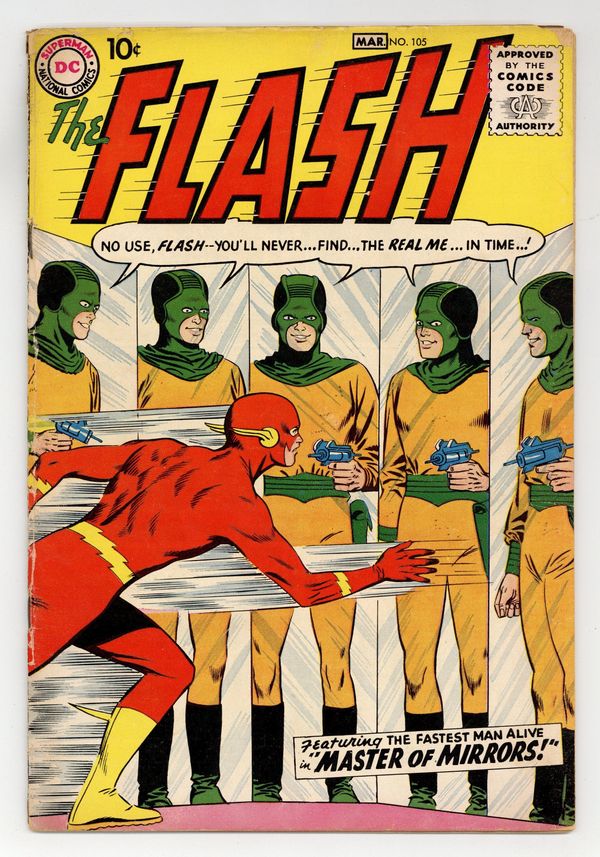 First issue in the Silver Age Flash series. Cover pencils by Carmine Infantino, inks by Joe Giella. 1st appearance of the Mirror Master in Master of Mirrors, script by John Broome, pencils by Carmine Infantino, inks by Joe Giella; Flash battles Sam The Mirror Master Scudder. Conqueror from 8 Million B.C.!, script by John Broome, pencils by Carmine Infantino, inks by Joe Giella; John Haines frees Katmos from his suspended animation and he begins his plans to take over the world. Amazing Speeds fact page by Julius Schwartz. Flash Facts filler page by Julius Schwartz. Birds In Flight fact page. Nature Wonderland fact page. 36 Pages, Full Color. Cover price $0.10. Grade: GD- 1.8 explanation of grade Condition: Used (collectible)