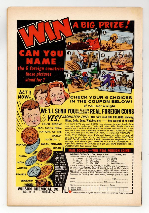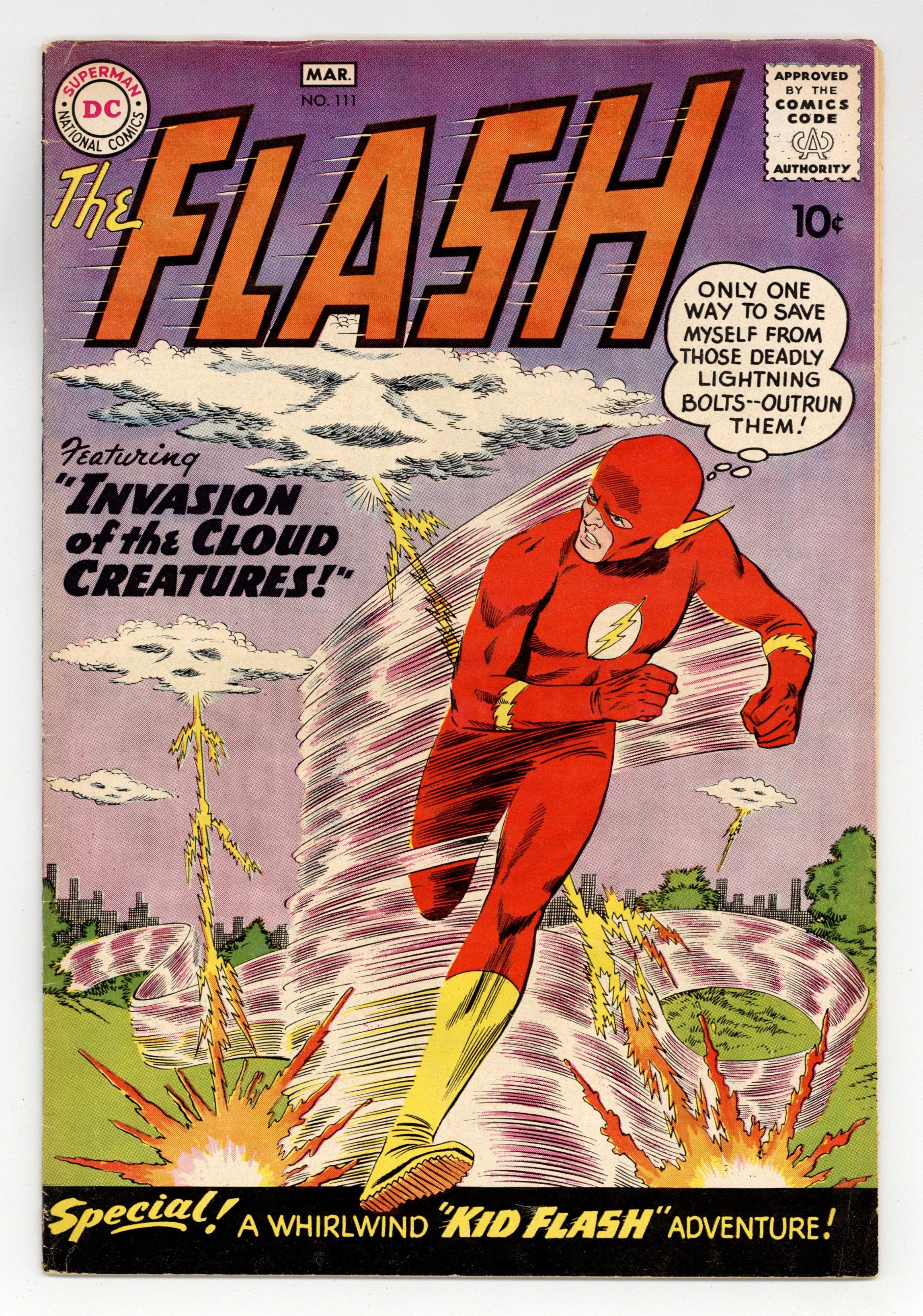 Cover pencils by Carmine Infantino, inks by Joe Giella. 2nd appearance of Kid Flash in The Challenge of the Crimson Crows, script by John Broome, pencils by Carmine Infantino, inks by Joe Giella; In Kid Flash's first solo adventure, he must stop a gang of kids before they get into trouble. Invasion of the Cloud Creatures!, script by John Broome, pencils by Carmine Infantino, inks by Murphy Anderson; Dr. Wiley Summers discovers Cloud Creatures who want to take over the Earth. It's Fun to Help Others public service announcement starring Superboy, script by Jack Schiff, pencils by Curt Swan, inks by Stan Kaye. The Speed of Sound! fact half-page. Volcanoes article. Ad for The Brave and the Bold #28 [first Justice League], pencils by Mike Sekowsky, inks by Murphy Anderson. Flash Facts filler page. 36 Pages, Full Color. Cover price $0.10. Grade: VG+ 4.5 explanation of grade Condition: Used (collectible)