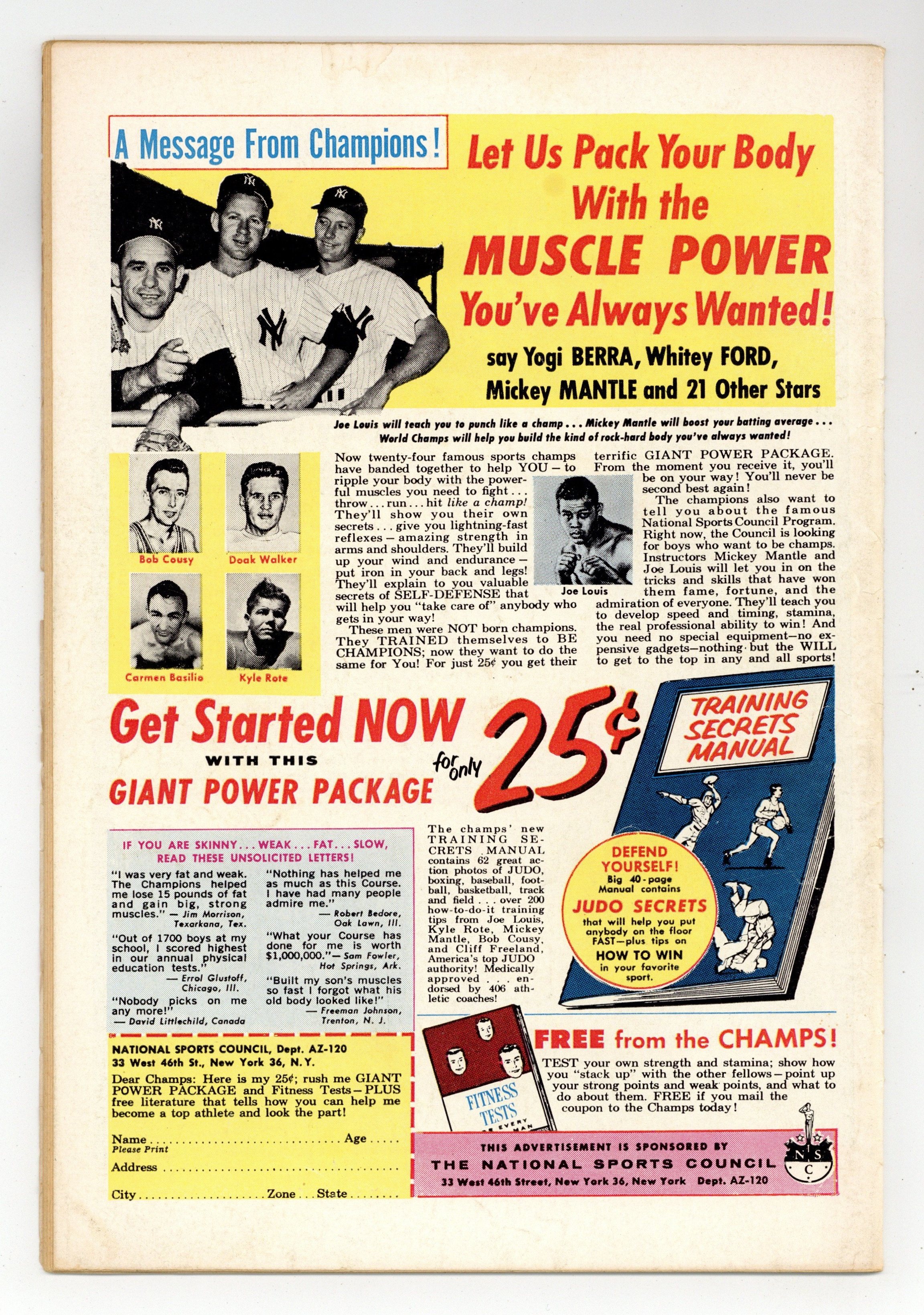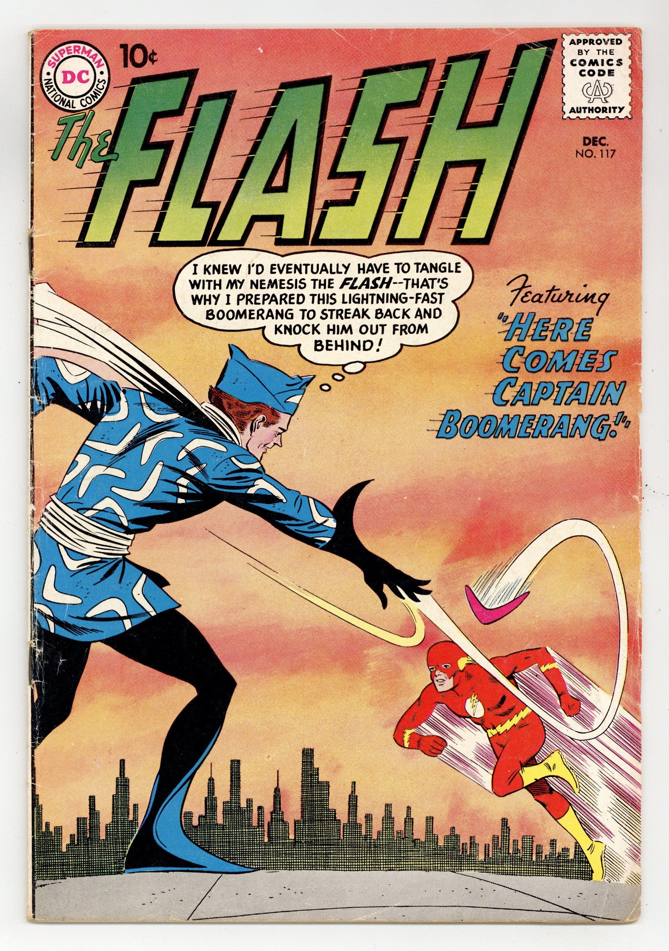 Cover pencils by Carmine Infantino, inks by Joe Giella. First appearance of Captain Boomerang in Here Comes Captain Boomerang!, script by John Broome, pencils by Carmine Infantino, inks by Murphy Anderson; W.W. Wiggins, the head of a game company, hires Digger Harkness to be his boomerang expert; Harkness becomes Captain Boomerang, commits crimes, and battles Flash. The Madcap Inventors of Central City!, script by Gardner Fox, pencils by Carmine Infantino, inks by Joe Giella; Winky, Blinky, and Noddy build a machine and start an inventing business. Letter to the editor from Fox himself! Ad for Giant Superman Annual. Comparative Speed Records fact page. Training Secrets Manual ad featuring Bob Cousy, Doak Walker, Carmen Basilio, and Kyle Rote. 36 Pages, Full Color. Cover price $0.10. Grade: VG- 3.5 explanation of grade Condition: Used (collectible)