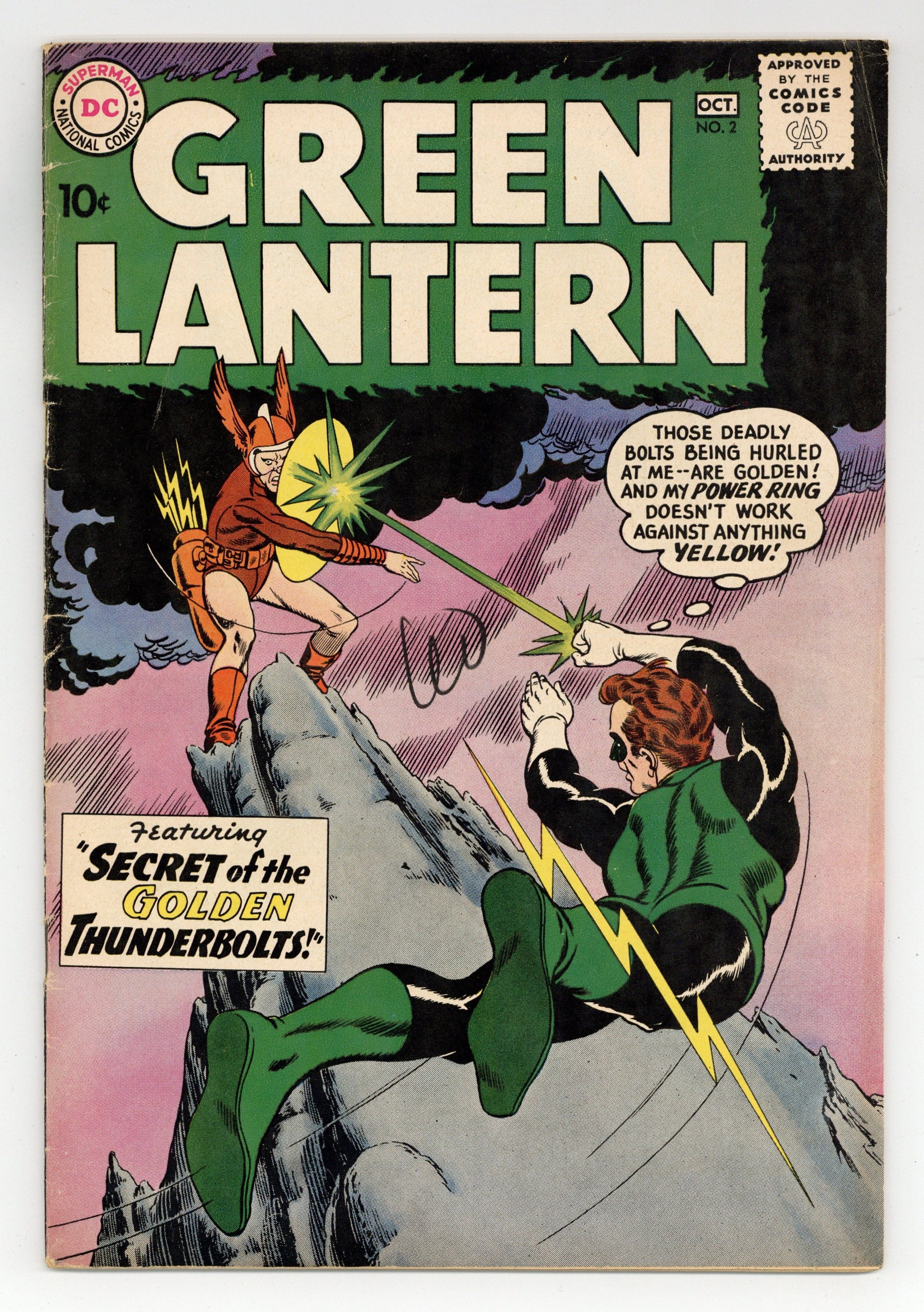 Cover pencils by Gil Kane, inks by Murphy Anderson. The Secret of the Golden Thunderbolts!, script by John Broome pencils by Gil Kane, inks by Joe Giella; Green Lantern learns of the anti-matter universe of Qward. He travels there to rescue the few lawful citizens and brings them to Earth and closes the portal between dimensions. Riddle of the Frozen Ghost Town!, script by John Broome, pencils by Gil Kane, inks by Joe Giella; Tom Kalmakus' father and Jimmy Dawes had stumbled on a gold mine and split the map for keeping while Dawes raised money to work it, but Tom's father died and Dawes lost his map while gambling. Duke Danfield won the map half and steals Tom's half to find the gold, but Green Lantern defeats his gang and Tom discovers Hal's secret identity as Green Lantern; Introduction of Pieface [Thomas Kalmaku]. 36 pages, full color. Cover price $0.10. Grade: VG+ 4.5 explanation of grade Condition: Used (collectible)
