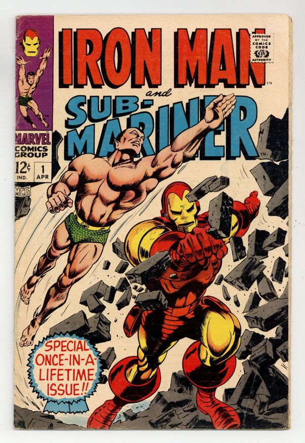 Cover pencils by Gene Colan, inks by Bill Everett. "The Torrent Without - The Tumult Within!," script by Archie Goodwin, pencils by Gene Colan, inks by Johnny Craig; Iron Man escapes from the trap set up by Whiplash and the Big M when a cadre of AIM agents attacks the Maggia's gambling ship. "Call Him Destiny... or Call Him Death!," script by Roy Thomas, pencils by Gene Colan, inks by Frank Giacoia; As Namor battles Destiny, the villain recounts his past connection to Namor's father. Pre-dates both Iron Man #1 and Sub-Mariner #1; Iron Man story continues in Iron Man #1, while the Sub-Mariner story continues in Sub-Mariner #1. 36 pgs., full color. $0.12. Cover price $0.12. Grade: VG- 3.5 explanation of grade Condition: Used (collectible)