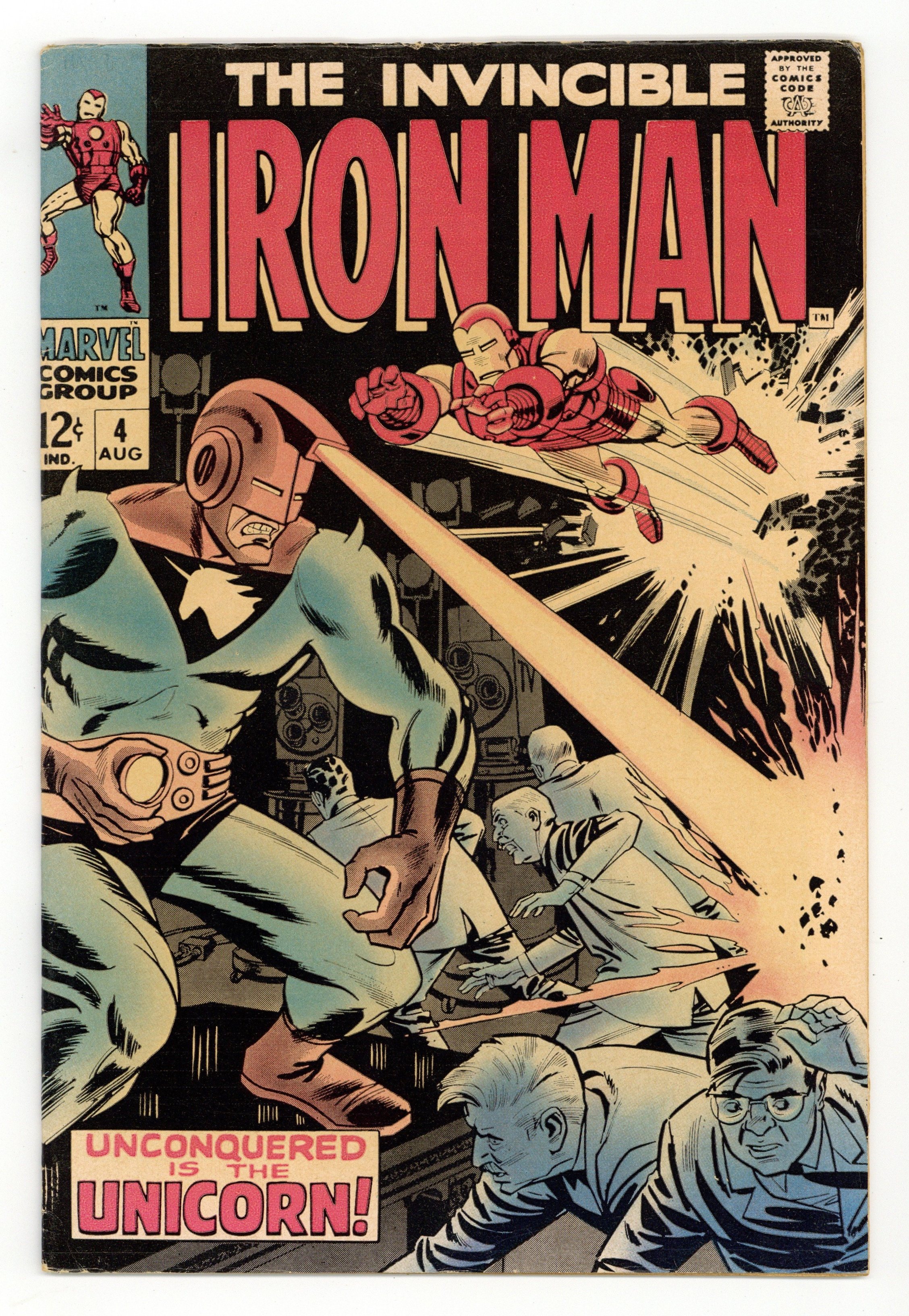 "Unconquered Is The Unicorn!" Script by Archie Goodwin. Art by Johnny Craig. Cover by Johnny Craig. Tony Stark attends a scientific conference at the Alpine Lodge when out of nowhere the Unicorn busts into the nationally televised meeting! While the Unicorn is making his demands to the TV audience, Tony finds his briefcase and changes into Iron Man! Can Shell-head win the slugfest against the powerful Unicorn? (Notes: The letters page includes a letter from comics historian Peter Sanderson. This issue also contains a full page ad for Silver Surfer issue 1 ? 1st series.) 32 pages Cover price $0.12. Grade: GD/VG 3.0 explanation of grade Condition: Used (collectible)