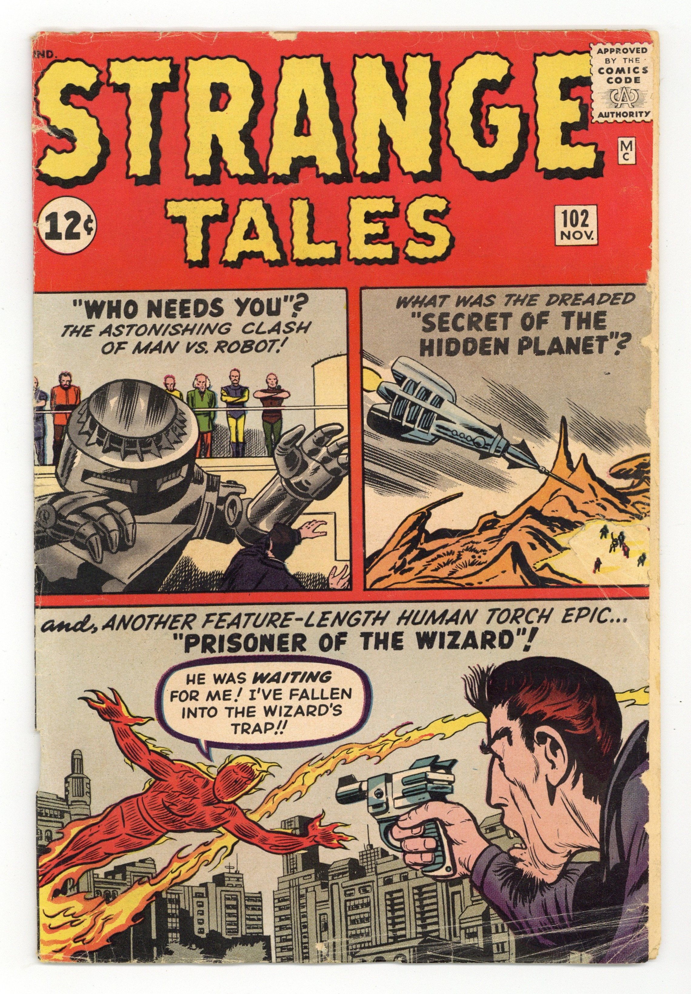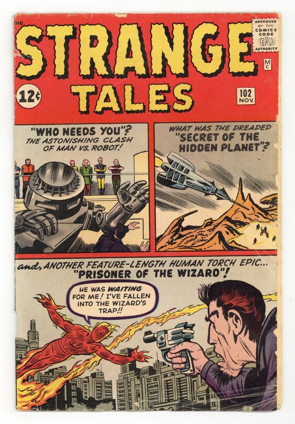 Cover pencils by Jack Kirby, inks by Dick Ayers. The Human Torch stars in "Prisoner of the Wizard," script by Stan Lee (plot) and Larry Lieber (script), pencils by Jack Kirby, inks by Dick Ayers; The Human Torch is tricked and trapped by the renowned genius the Wizard, who impersonates the Torch to frame him for crimes. "The Treasure" text story. "The Secret of the Hidden Planet!", pencils by Gene Colan; Human-like aliens are seen on Venus, and a wicked pilot poisons his rival to be able to make first contact. "Who Needs You?", script by Stan Lee, art by Steve Ditko; A general who has the responsibility of launching a nuclear counter attack is replaced by a robot that his bosses think is more suited for a role that requires perfection; When an unidentified radar object approaches at ICBM speed, the robot concludes that it must be a Soviet first strike and prepares to launch a counter attack. 36 pgs., full color. Cover price $0.12. Grade: GD+ 2.5 explanation of grade Condition: Used (collectible)