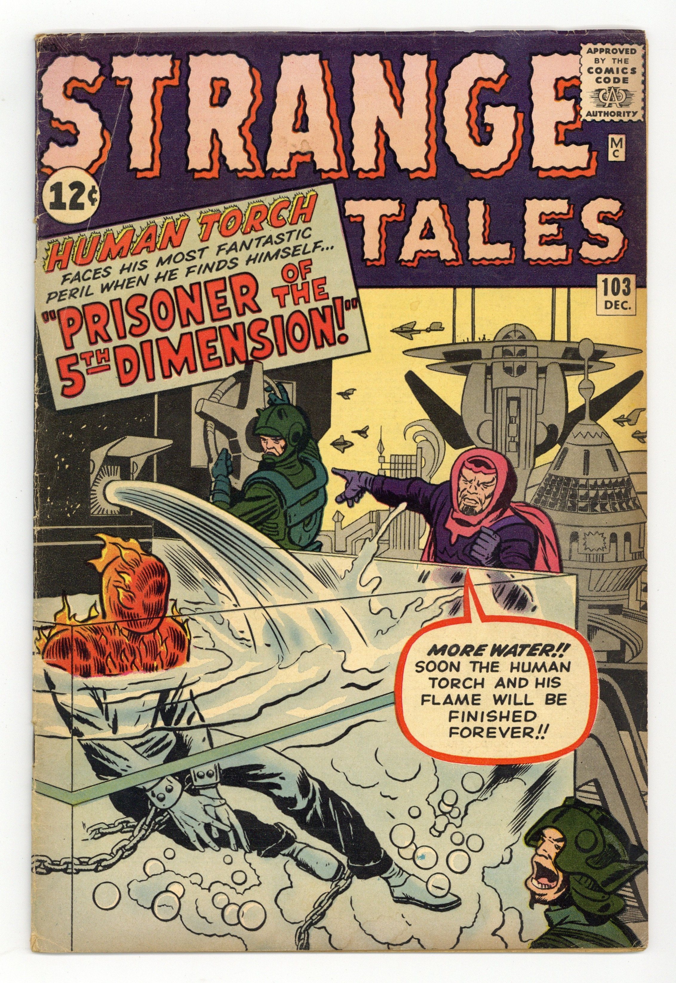 Cover pencils by Jack Kirby, inks by Dick Ayers. The Human Torch stars in "Prisoner of the 5th Dimension!" (and it's not referring to the sixties pop group!), script by Stan Lee (plot) and Larry Lieber (script), pencils by Jack Kirby, inks by Dick Ayers; The Human Torch discovers an impending invasion from the 5th Dimension, but he is captured by that dimensions tyrannical ruler; The Torch is freed by the tyrants opponents. "Lady Luck" text story. "The Little People!", script by Stan Lee (plot) and Larry Lieber (script), art by Don Heck; An American expatriate stumbles across tiny people in Europe who seem to recognize him; He is captured and escapes, thinking the experience was a dream, but wondering about reincarnation. "Jasper's Jalopy," script by Stan Lee, art by Steve Ditko; A man is mocked for keeping his old car, but it saves his life by sacrificing itself to keep him from crossing an unsafe bridge. 36 pgs., full color. Cover price $0.12. Grade: VG- 3.5 explanation of grade Condition: Used (collectible)