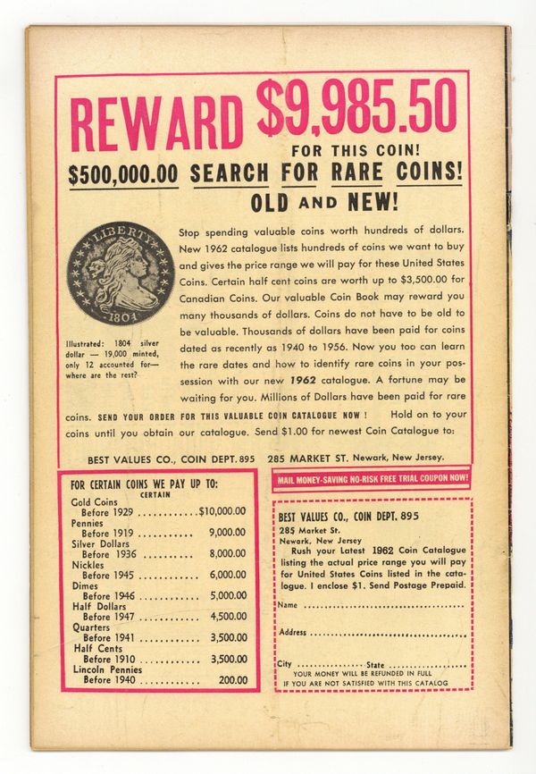 Cover pencils by Jack Kirby, inks by Dick Ayers. The Human Torch stars in "The Return of the Wizard!", script by Stan Lee (plot) and Larry Lieber (script), pencils by Jack Kirby, inks by Dick Ayers; In prison, The Wizard becomes a model prisoner—just so he can become a trustee, work in the hospital, have access to chemicals...and break jail! "Discovery," art by Joe Maneely; A scrawny man is given a magic candy bar that confers great strength, but he discovers that he already possesses more strength than he suspects. "Man Alone!", script by Stan Lee (plot) and Larry Lieber (script), art by Don Heck; A man has recurring dreams of solitary confinement and goes to sea to escape this fate. He is shipwrecked and left alone on a desert island, unaware that this is the solitude he was destined for. "The Supernatural!", script by Stan Lee, art by Steve Ditko; A house appears to be magically dismantled by wisps of smoke, but it is only a girl playing with her dollhouse while her father smokes. 36 pgs., full color. Cover price $0.12. Grade: GD+ 2.5 explanation of grade Condition: Used (collectible)