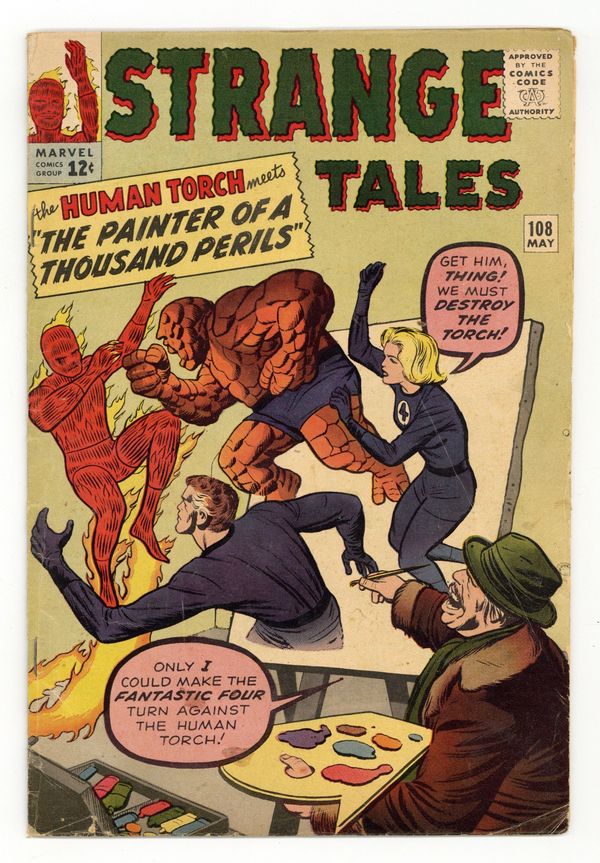 Cover pencils by Jack Kirby, inks by Dick Ayers. The Human Torch stars in "The Painter of a Thousand Perils!", script by Stan Lee (plot) and Robert Bernstein [as R. Berns] (script), pencils by Jack Kirby, inks by Dick Ayers; A counterfeiter caught by the Human Torch finds magic paints and uses them to escape from prison and strike back at the Torch; Fantastic Four guest appearance. "The Heat's On" text story, art by Don Heck. "The Silent Giant," script by Stan Lee (plot) and Larry Lieber (script), pencils by Larry Lieber, inks by Sol Brodsky; An old hermit becomes enraged that the nearby redwood tree will outlive him, but when he dies the tree transforms its friend into an immortal redwood too. "The Iron Warrior," art by Steve Ditko; A knight of King Arthur's court resents the favor shown Merlin and so challenges him to a battle; Merlin's champion, a black knight, wins the competition; The envious knight still sneers at Merlin and claims he has no true magic powers. 36 pgs., full color. Cover price $0.12. Grade: VG- 3.5 explanation of grade Condition: Used (collectible)