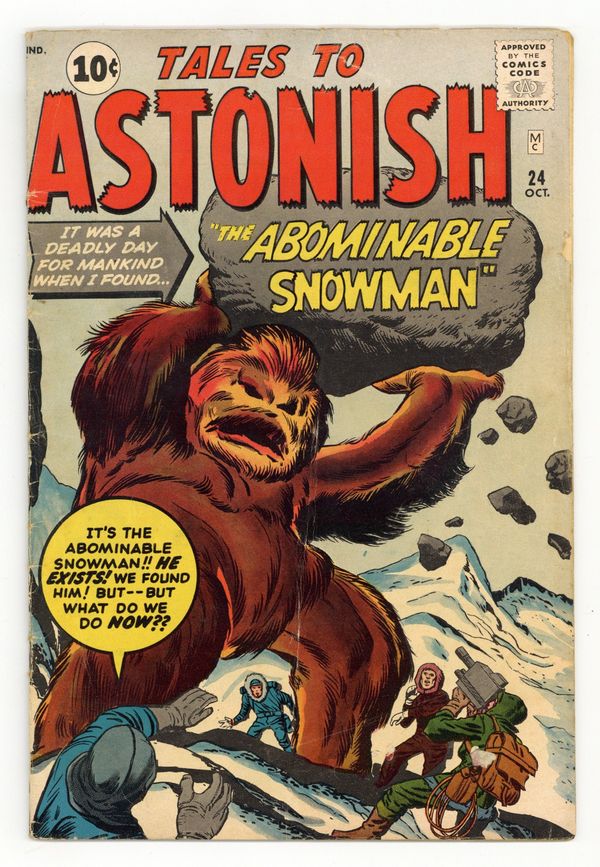 Cover by Jack Kirby and Dick Ayers. I Found the Abominable Snowman! Part 1, art by Jack Kirby and Dick Ayers; A TV producer fakes a film of the Abominable Snowman in the arctic, but runs afoul of an ancient underground civilization of lizard-men and a giant octopus. The Snowman's Secret!, art by Jack Kirby and Dick Ayers. The Recipe text story. Something Missing!!, art by Don Heck; The first mission to Mercury has a stow-away, the lover of one of the pilots. He Waits in the Dark!, script by Stan Lee, art by Steve Ditko; A mysterious janitor comes to work for a slumlord, but he has strange powers and ends the man's evil ways. 36 pgs., full color. $0.10. Cover price $0.10. Grade: GD/VG 3.0 explanation of grade Condition: Used (collectible)