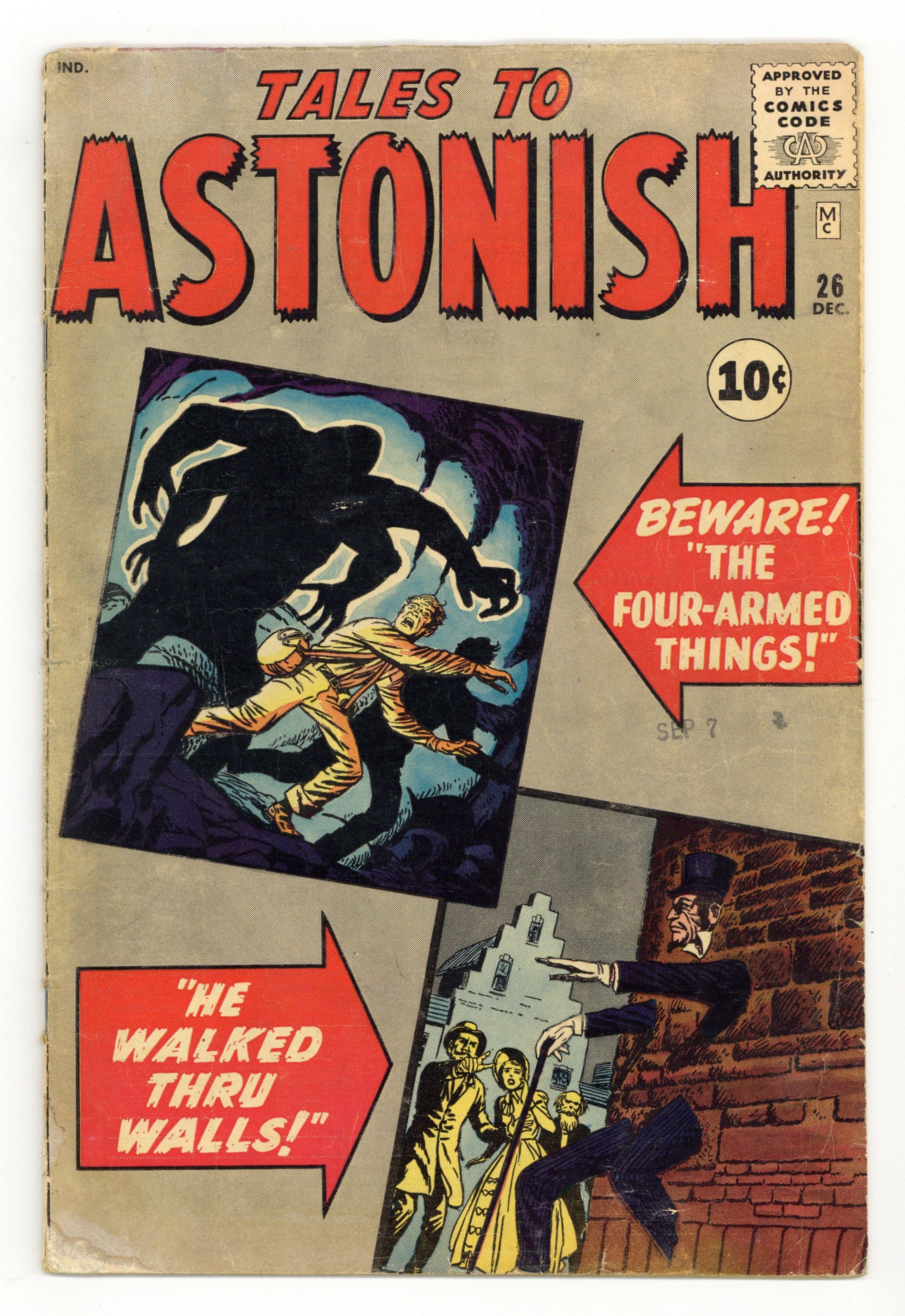 Cover by Jack Kirby and Dick Ayers. Look Out!! Here Come the...Four-Armed Men!, art by Jack Kirby and Dick Ayers; An explorer learns of an invasion of four-armed aliens. The Weatherman, art by Joe Maneely. He Walked Through Walls!, art by Jack Kirby and Dick Ayers; A stranger performs feats of magic, and offers anything that people might want if they sign a contract. Run, Rocky, Run!, art by Bob Forgione; A criminal on the run plans to stow-away on the experimental rocket he reads about, but finds out too late that is an advanced miniature rocket that cannot carry a pilot. Dream World, script by Stan Lee, art by Steve Ditko; A man repeatedly dreams that his bed is levitating, and cant tell if hes dreaming or not. 36 pgs., full color. $0.10. Cover price $0.10. Grade: PR 0.5 explanation of grade Condition: Used (collectible)