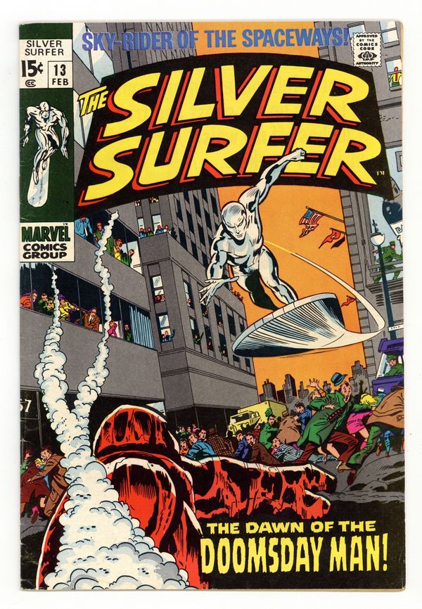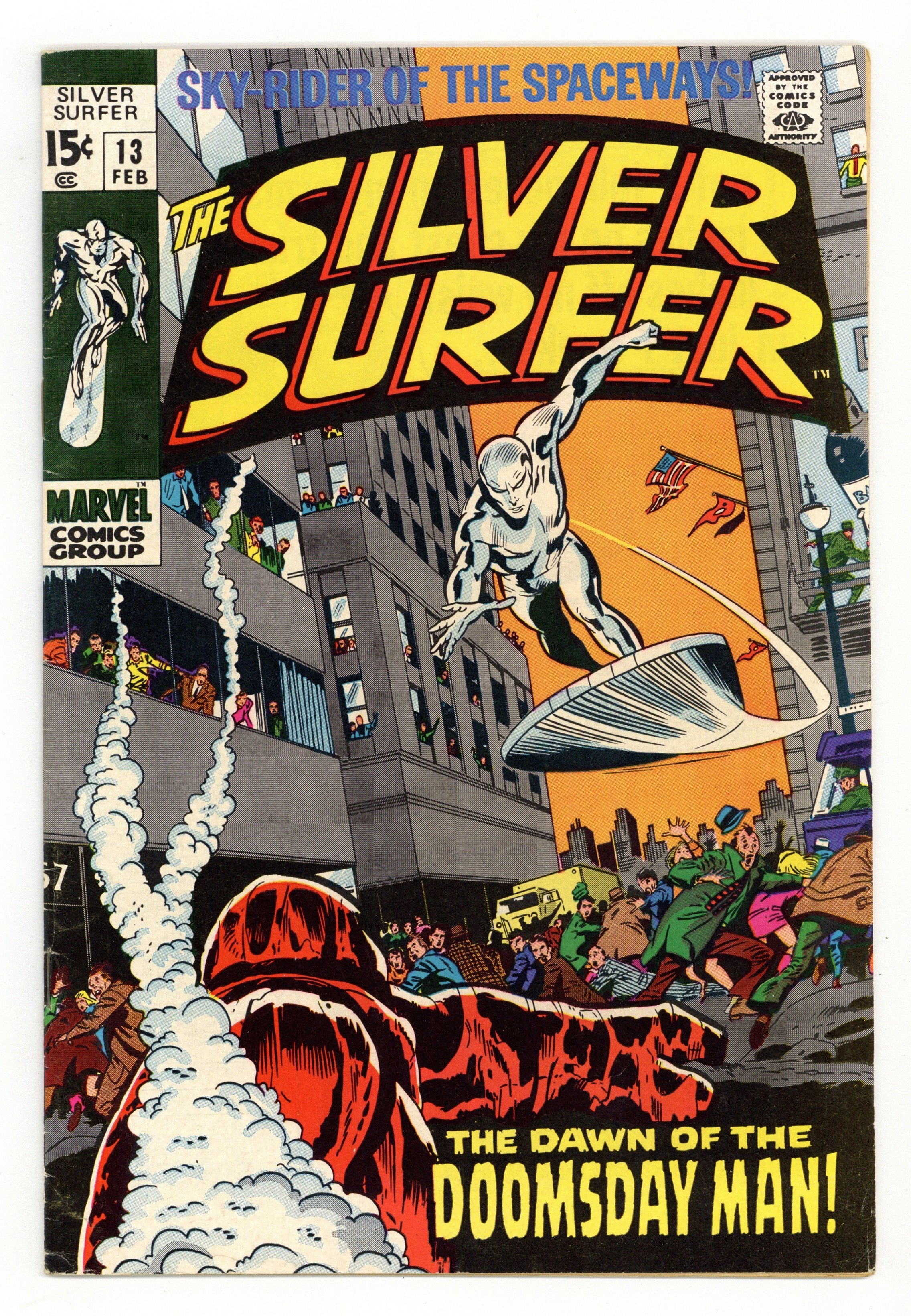 "The Dawn of the Doomsday Man!" Written by Stan Lee. Art by John Buscema and Dan Adkins. The ground rumbles and the citizens of New York City tremble in fear as the monstrosity known as the Doomsday Man rise from the bowels of the earth. Only the Silver Surfer, a being whom the people of Earth have ridiculed and alienated time and again, can save them now. Cover price $0.15. Grade: FN+ 6.5 explanation of grade Condition: Used (collectible)