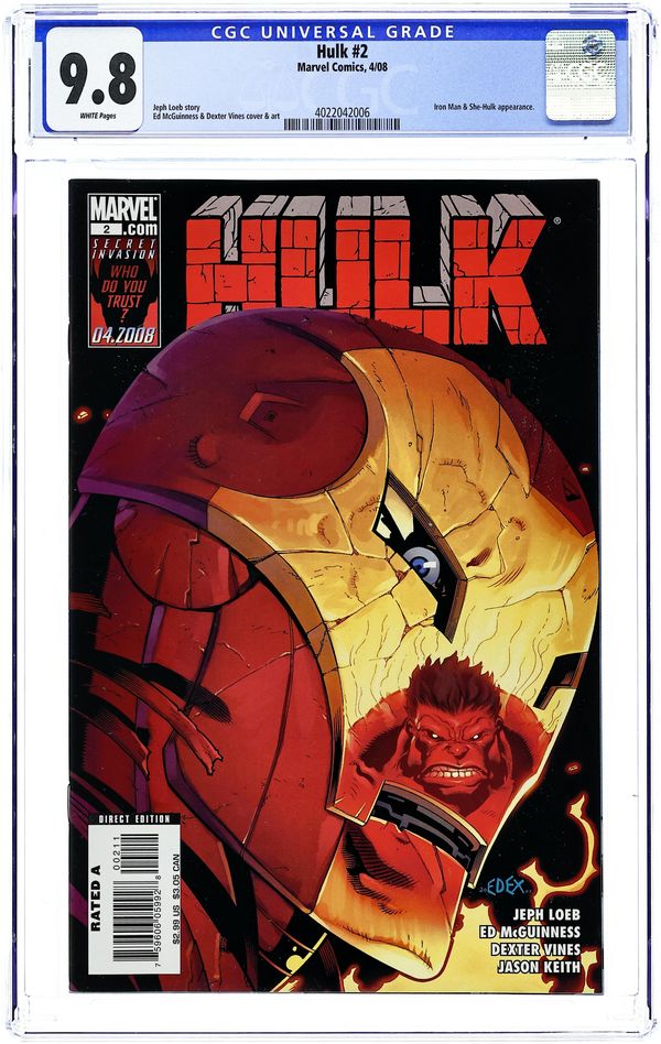 Ends Dec 8 8:35 PM CST Bid History 4 bids Current Bid $16 Your Secret Max Bid If you'd like to bid, please log in or register. First Printing. Written by JEPH LOEB Pencils & Cover by ED MCGUINNESS. Who is The Red Hulk? Part II. After last issue's shocking murder, there's evidence on the S.H.I.E.L.D. Helicarrier that will bring down the killer. So...The Hulk is going after it - and might bring down the Helicarrier instead! The one person standing in the Hulk's path - Iron Man! Also, the return of the LAST person you ever expected to see! Game on! Cover price $2.99. Grade: CGC 9.8 explanation of grade Condition: Used (collectible)