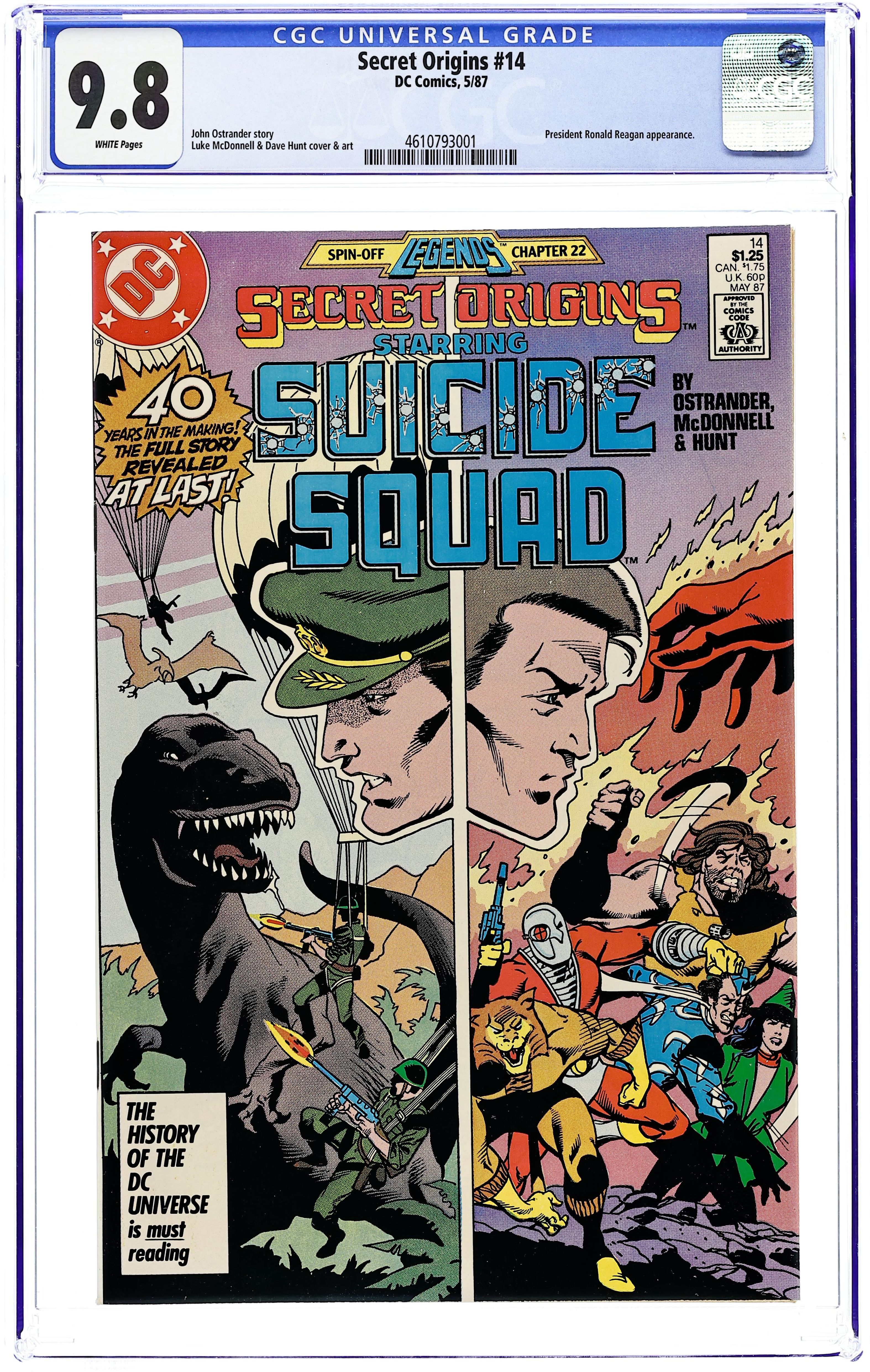Direct Edition. Cover pencils by Luke McDonnell, inks by Dave Hunt. The Secret Origin of the Suicide Squad, script by John Ostrander, pencils by Luke McDonnell, inks by Dave Hunt; a look at the history of the Suicide Squad and Task Force X. 52 pgs. $1.25. Legends chapter 22. Cover price $1.25. Grade: CGC 9.8 explanation of grade Condition: Used (collectible)