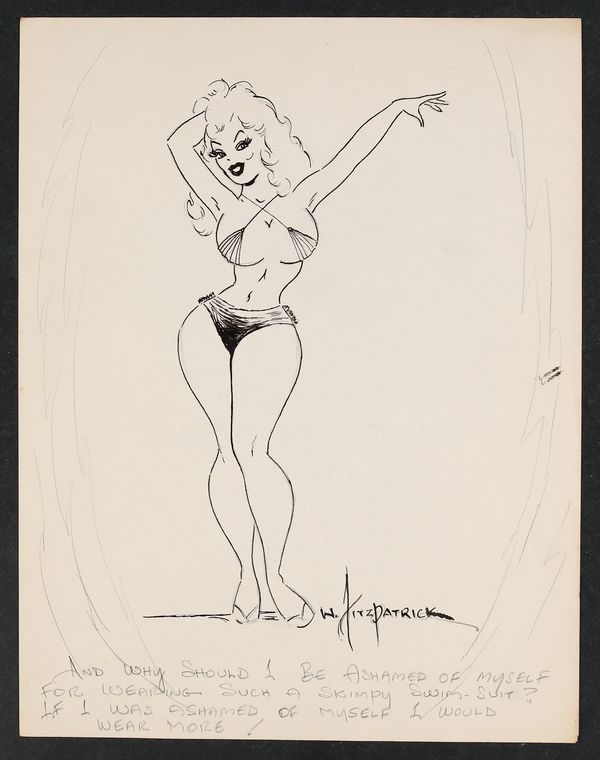 • While the place of publication for this piece is unknown, Fitzpatrick was a prolific cartoonist contributing mainly to various Humorama publications like Jest and Gaze in the 50's and early 60's. Signed by the artist. Pencil and ink on paper. 8 1/2" x 11".