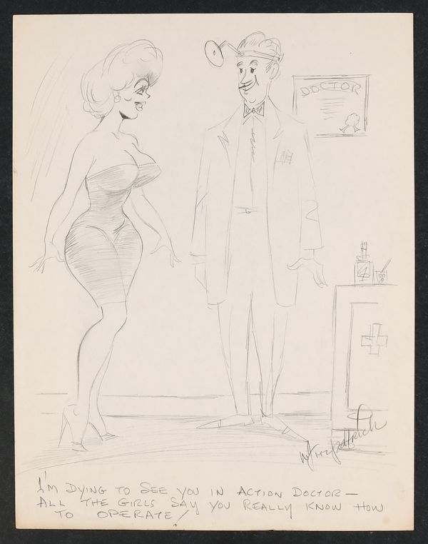 While the place of publication for this piece is unknown, Fitzpatrick was a prolific cartoonist contributing mainly to various Humorama publications like Jest and Gaze in the 50's and early 60's. Signed by the artist. Pencil on paper. 8 1/2" x 11".