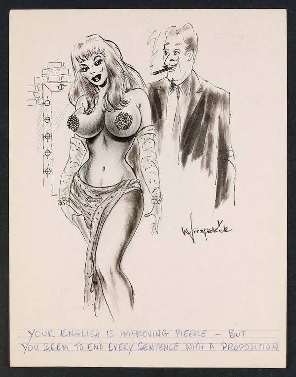 • While the place of publication for this piece is unknown, Fitzpatrick was a prolific cartoonist contributing mainly to various Humorama publications like Jest and Gaze in the 50's and early 60's. Signed by the artist. Pencil and ink on paper. 8 1/2" x 11".