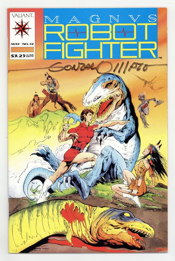 Starts May 11 44-page giant; introduction of Turok to the Valiant Universe. Magnus visits the Lost Valley where he confronts Doctor Laslo Noel in "Stone and Steel!" Written by Faye Perozich and Jim Shooter, with art by Gonzalo Mayo. Characters: Andar; Doctor Laslo Noel; Elzy; Gork; Magnus; Turok; Willow Talltree. Plus: 1-A's failed experiments subject their creator to a mock trial, where we see parts of the robot's past, in the 8-page "Trial and Error." Written by Jim Shooter and Faye Perozich, with art by Mark Moretti and Charles Barnett III. Characters: 1-A (hologram); Cracker; Magnus (hologram). Cover by Gonzalo Mayo. Cover price $3.25. Grade: VF/NM 9.0 explanation of grade Condition: Used (collectible)