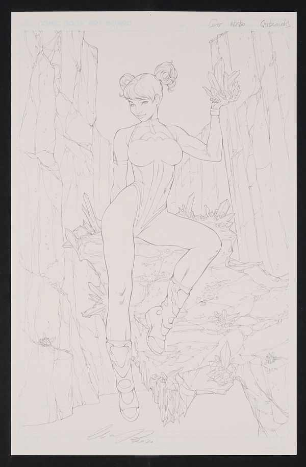 A Kickstarted creation by artist CB Zane, The Mighty Mite looks mighty good in this fantastic cover from pinup pro Elias Chatzoudis, shining like gems all around her! Signed by Chatzoudis in lower margin and includes a certificate of authenticity from Chatzoudis. Pencil on comic art board. 11" x 17"