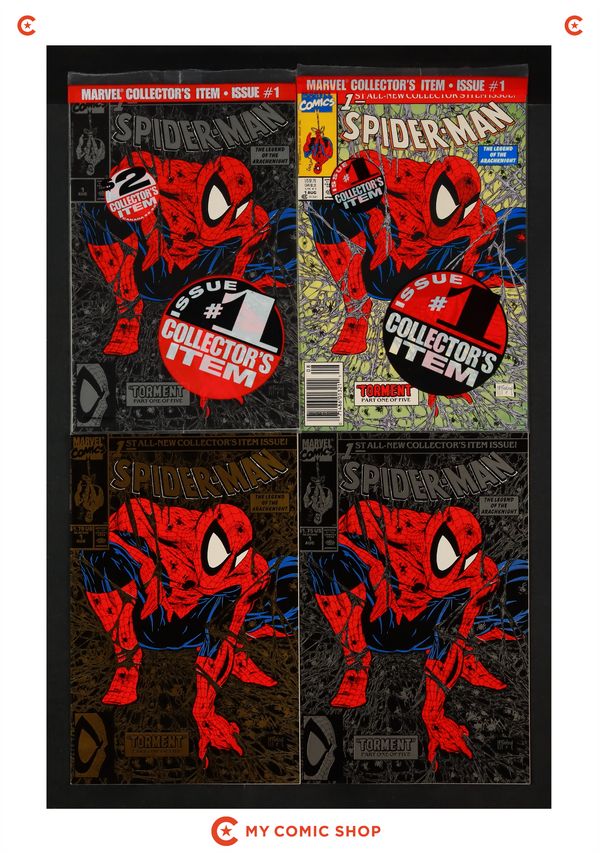 Issues 1BP, 1GOLD, 1SILVER, and 1SILVERP of Spider-Man (1990 Marvel). Most will grade in the NM to VF range.
