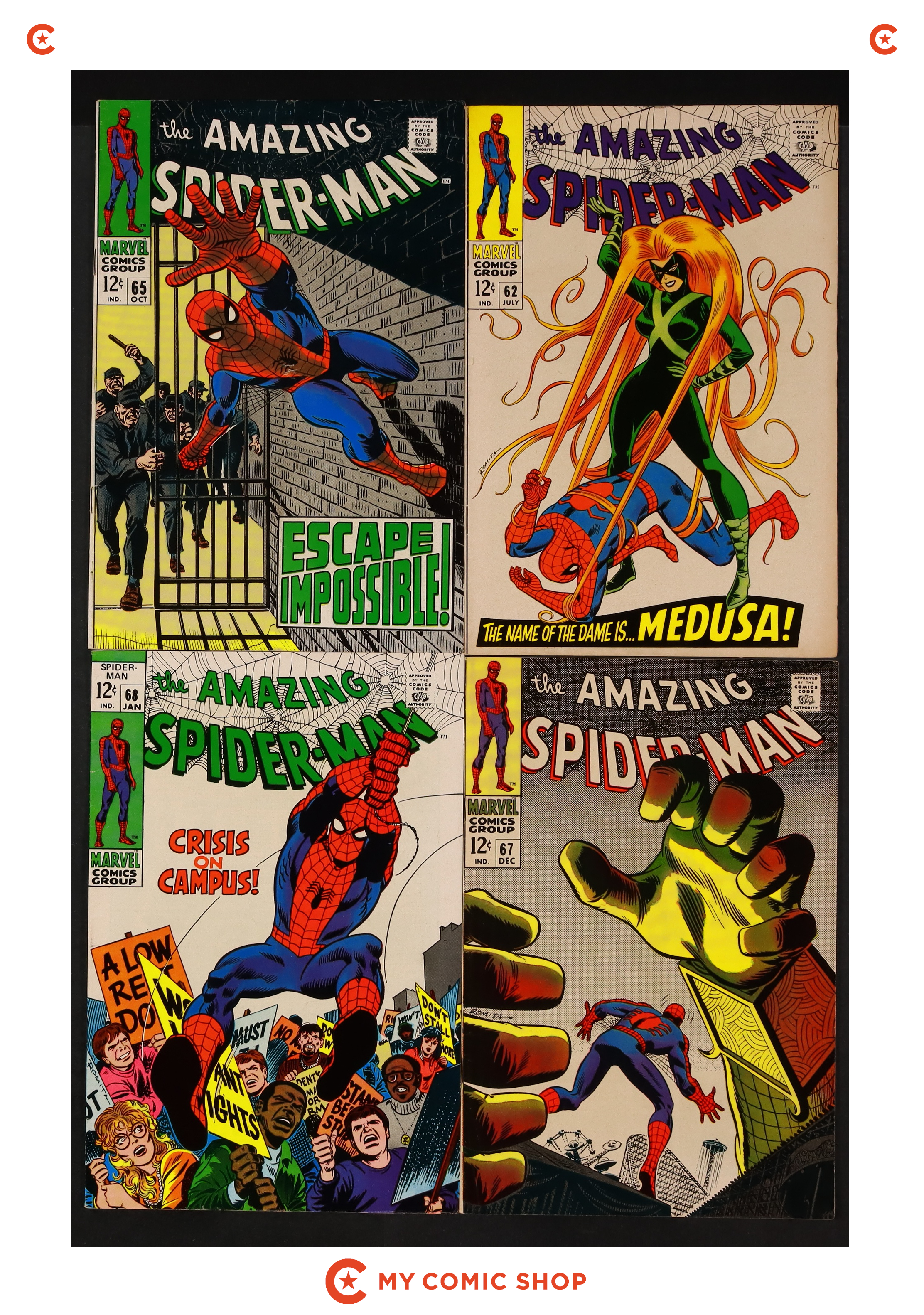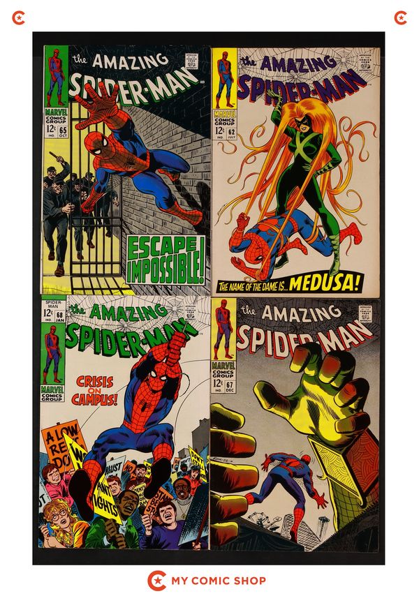 Issues 62, 65, 67, 68 of Amazing Spider-Man (1963 1st Series). Most will grade in the VG+ to FN range, with #65 grading at GD/VG.