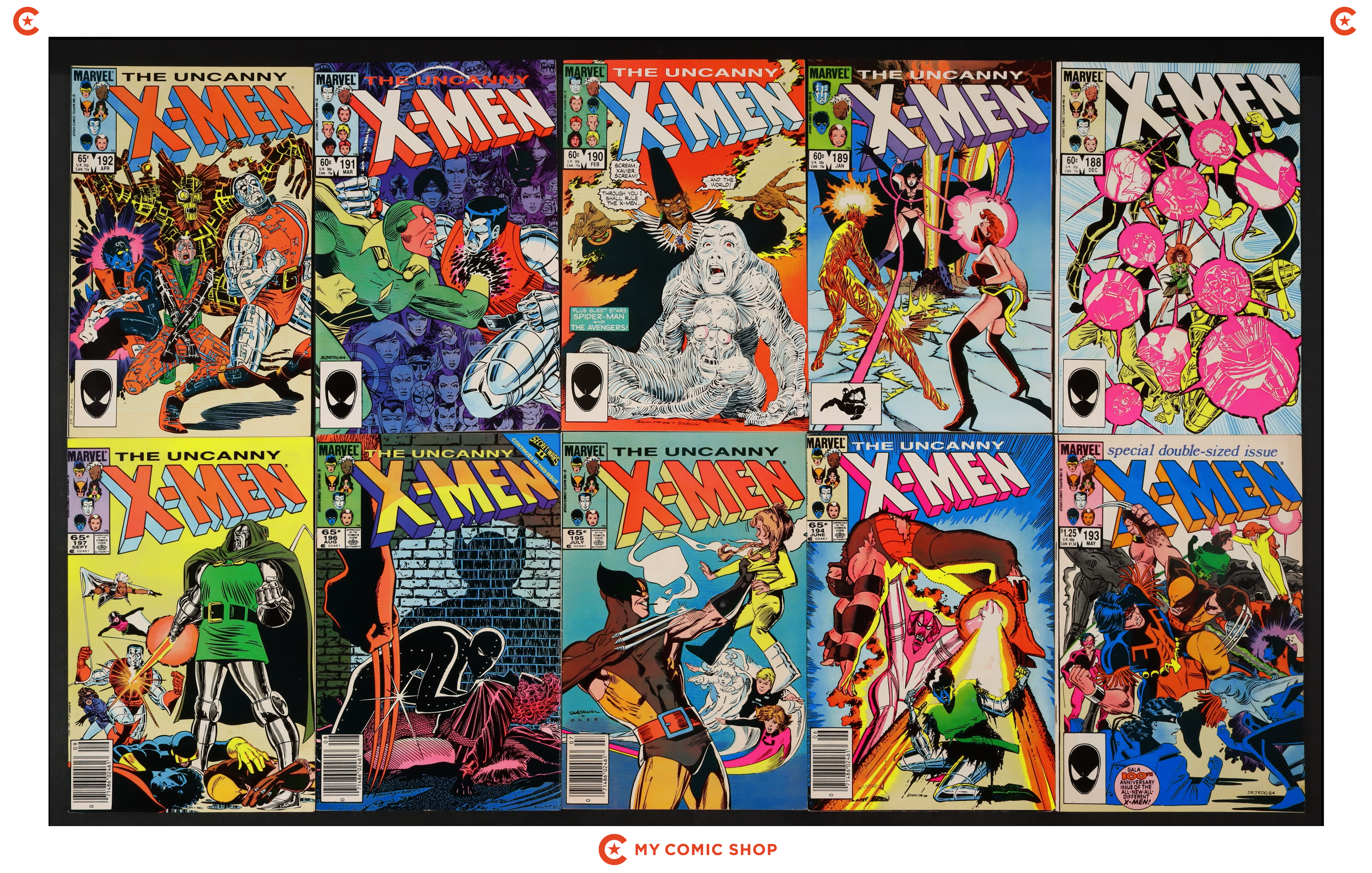 Issues 188-194 and 195N-197N of Uncanny X-Men (1963 1st Series). Most will grade in the FN/VF to FN range with a couple grading closer to VG.