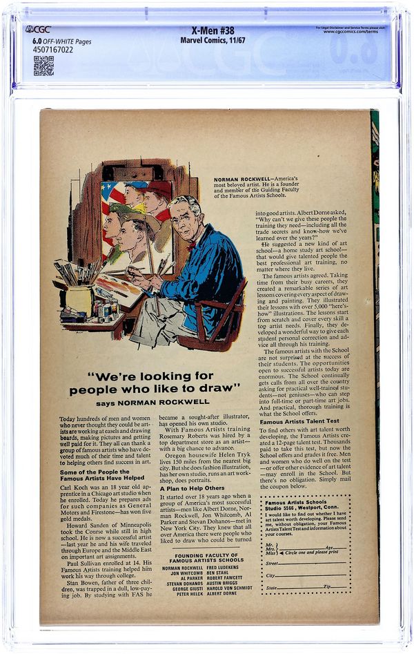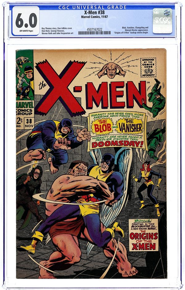 Cover art by Dan Adkins. The Sinister Shadow of...Doomsday!, script by Roy Thomas, pencils by Don Heck, inks by George Roussos [as George Bell]; Mutant Master tells the Changeling about his plans to initiate the human in a third world war; Marvel Girl, Beast and Angel go to Europe; Iceman and Cyclops go to Washington. A Man Called...X--The Origins of the Uncanny X-Men, script by Roy Thomas, pencils by Werner Roth, inks by John Verpoorten; origin of Cyclops. 36 pgs. $0.12. Cover price $0.12. Grade: CGC 6.0 explanation of grade Condition: Used (collectible)