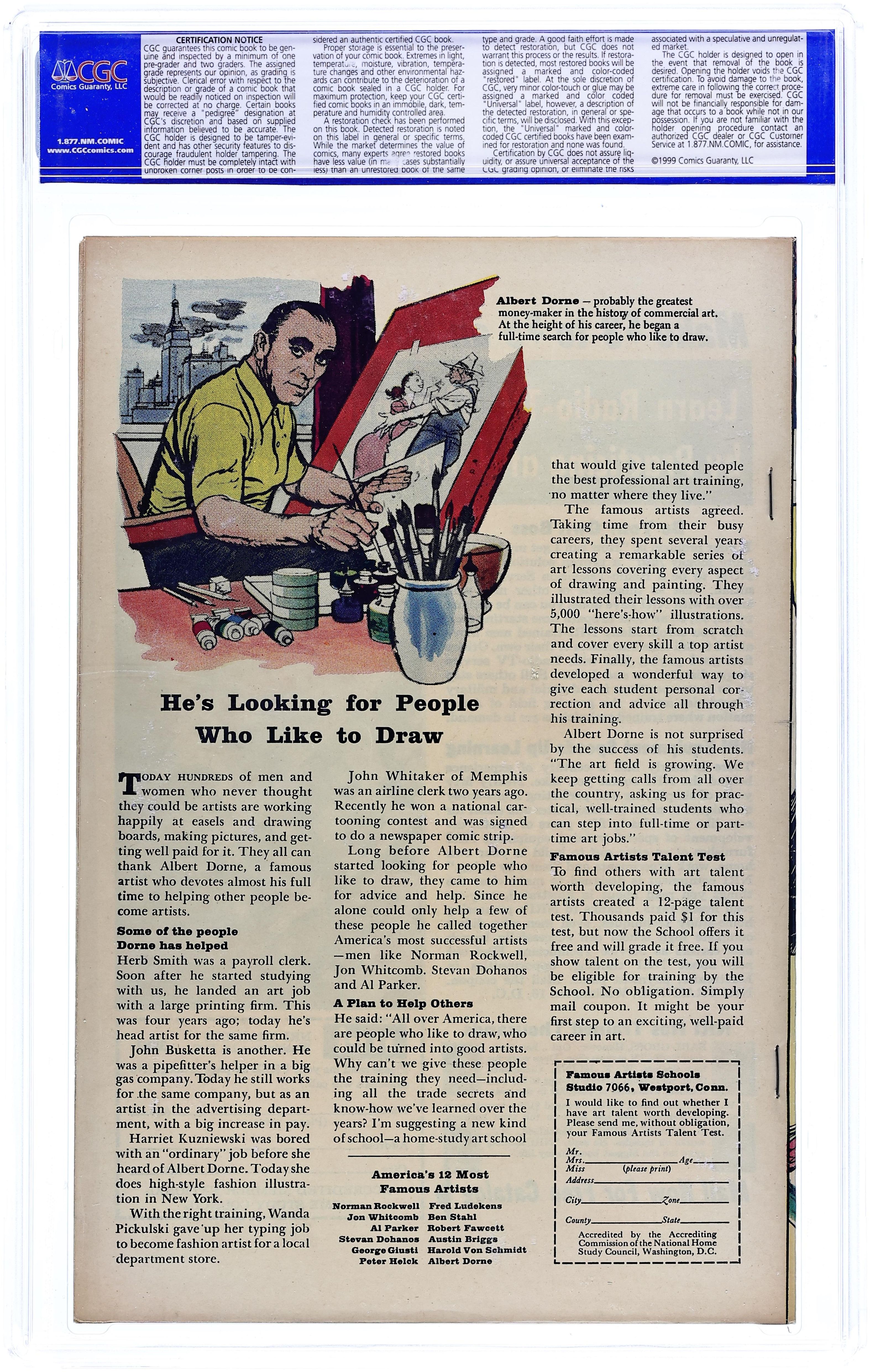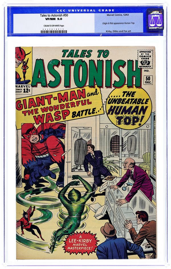 Cover by Jack Kirby and Sol Brodsky. The Human Top!, script by Stan Lee, art by Jack Kirbym, Steve Ditko, and Don Heck; Henry Pym follows the crime spree of the Human Top in the newspapers but the Wasp convinces Henry to go after him as Giant-Man. Mystery Trip text story, art by Joe Maneely; Tommy's uncle returns from a space journey needing to re-learn how to walk on earth instead of floating. The Secret of Sagattus!, script by Stan Lee and Larry Lieber, art by Larry Lieber and Matt Fox; A wise king listens only to the advice of a hunchback, causing the jealous nobles to murder the hunchback. No Ending!, script by Stan Lee and Larry Lieber, art by Larry Lieber; A dictator is tormented by dreams of running on a treadmill suspended high in the sky. 36 pgs., full color. $0.12. Cover price $0.12. Grade: CGC 9.0 explanation of grade Condition: Used (collectible)