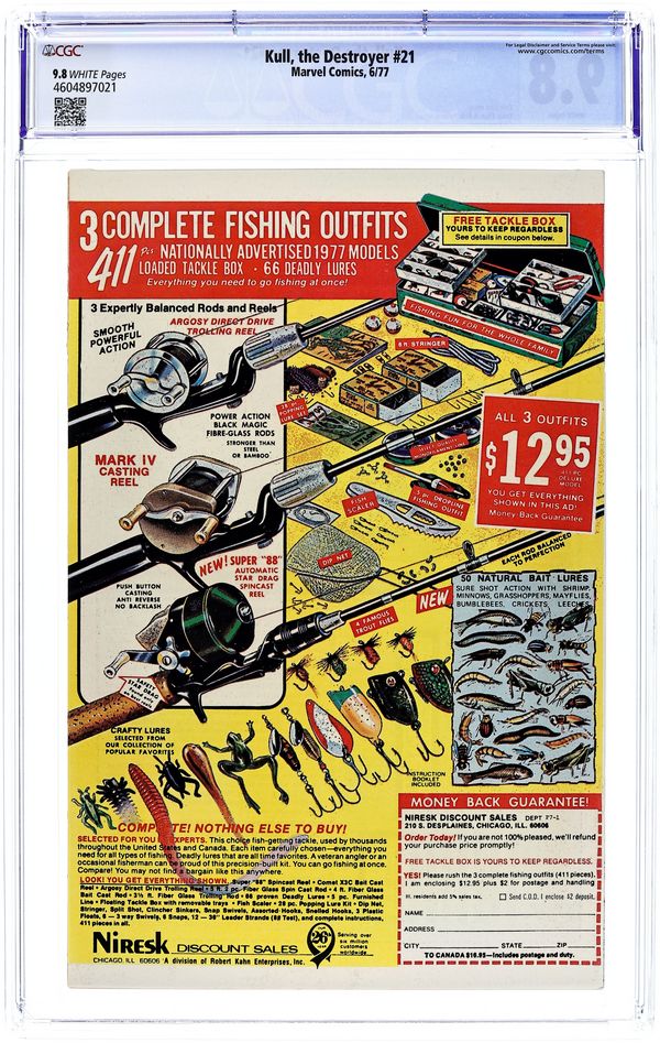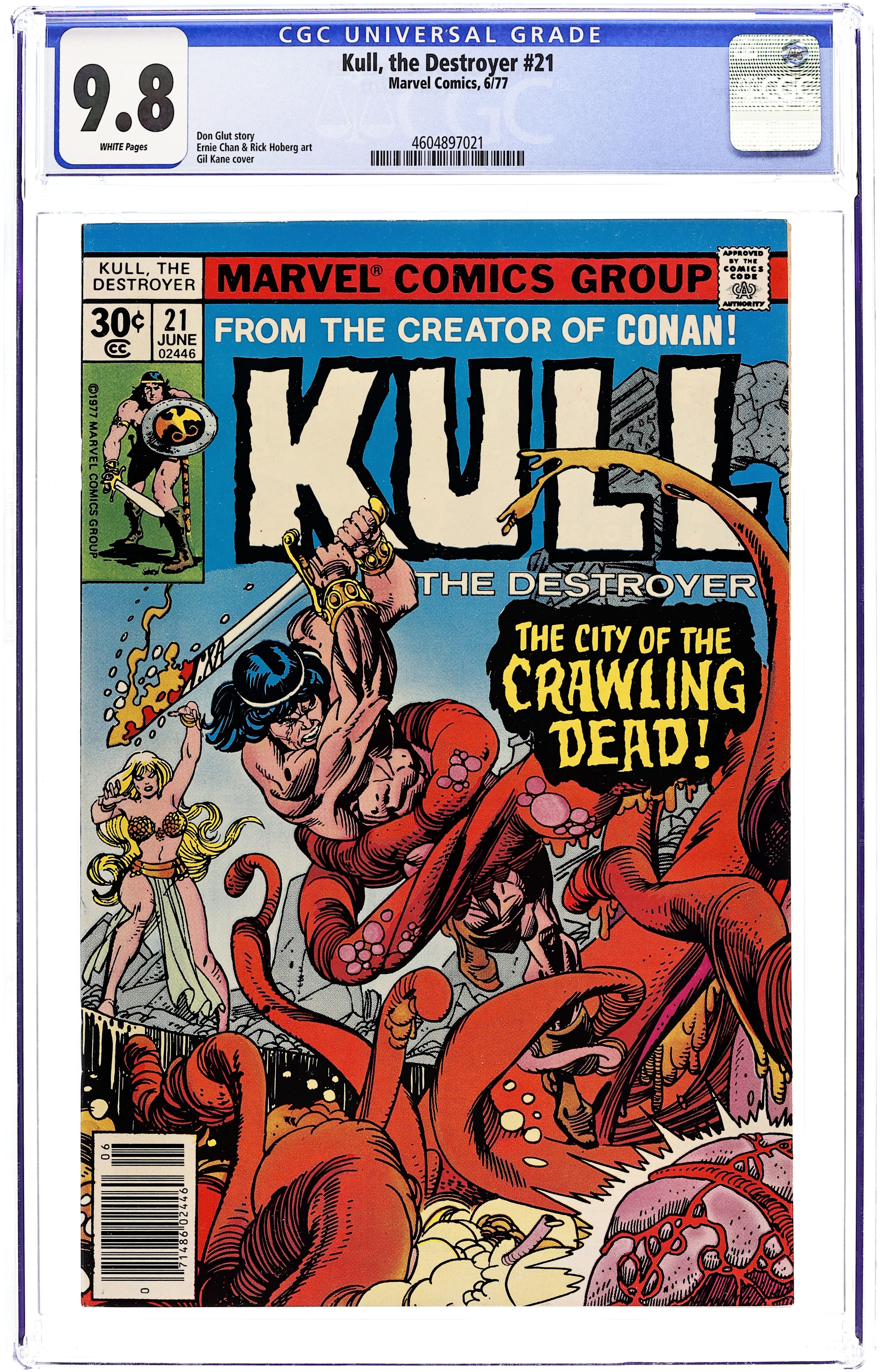 City of the Crawling Dead - Written by Don Glut. Art by Ernie Chan and Rick Hoberg. Cover by Gil Kane. King Kull in heated battle in the city of the crawling dead! Also: "Captain America and the Sore Sir's Apprentices" ad for Hostess Cupcakes with art by Sal Buscema and Frank Giacoia. 32 pages, full color. Cover price $0.30. Grade: CGC 9.8 explanation of grade Condition: Used (collectible)