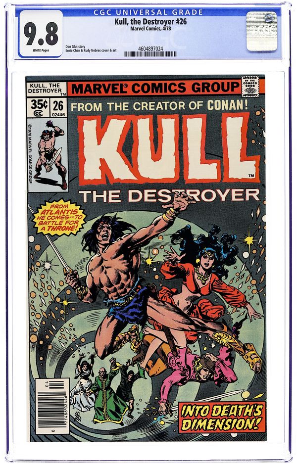 Into Death's Dimension - Written by Don Glut. Art and Cover by Ernie Chan and Rudy Nebres. Kull the Destroyer! From Atlantis he comes -- to battle for a throne! 32 pages, full color. Cover price $0.35. Grade: CGC 9.8 explanation of grade Condition: Used (collectible)
