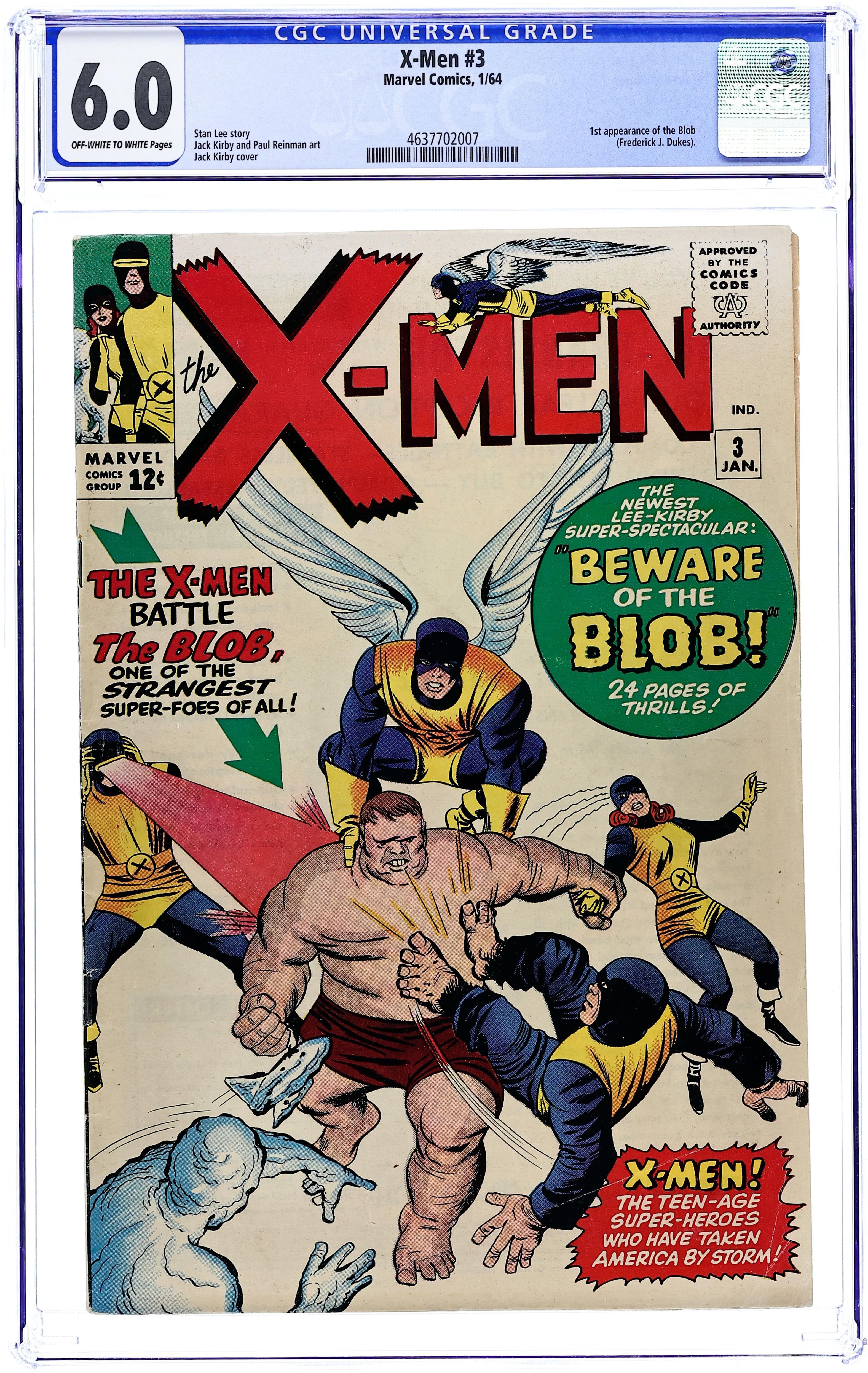 Ended Oct 15 2025 Bid History 16 bids Winning Bid $655 First appearance of the Blob. Cover pencils by Jack Kirby. Beware of the Blob!, script by Stan Lee, pencils by Jack Kirby, inks by Paul Reinman; Professor X detects a new mutant and sends the X-Men to investigate; They arrive at a carnival and encounter the Blob, a very fat sideshow attraction who can bounce bullets off of his malleable hide as well as anchor himself to the earth and become immovable; The X-Men bring him back to the mansion as a potential member but the Blob spurns their invitation and returns to the carnival; Realizing that the Blob knows their secret, the X-Men lure him back to the mansion where Xavier wipes his memory. 36 pgs. $0.12. Cover price $0.12. Grade: CGC 6.0 explanation of grade Condition: Used (collectible)