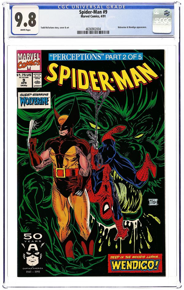 Direct Edition. Perceptions Part 2 of 5. Guest-starring Wolverine. Script and art by Todd McFarlane. Cover by Todd McFarlane. The feral mutant with adamantium claws joins the search in British Columbia for the unknown child killer. And withhis enhanced tracking senses, Wolverine has a good chance of locating the murderer before the Canadian authorities do. In the meantime, Peter Parker hits the streets to learn information about the homicides. And after talking with an old man...he hears the word "Wendigo" for the first time (inregard to the murders). Oh no, has an ancient evil returned to stalk the Canadian wilderness? (Note: This five-part story was reprinted in 2012 in the hardcover: Spider-Man Perceptions.) 32 pages. Cover price $1.75. Grade: CGC 9.8 explanation of grade Condition: Used (collectible)