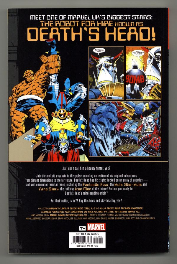 1st printing. Collects Dragon's Claws (1988) #5, Death's Head (1988 Marvel) #1-7 and 9-10, Death's Head: The Body in Question GN (1990 Marvel), Fantastic Four (1961-1996 1st Series) #338, The Sensational She-Hulk (1989-1994) #24, What If (1989-1998 2nd Series) #54, MARVEL HEROES #33 and material from Marvel Comics Presents (1988-1995) #76.