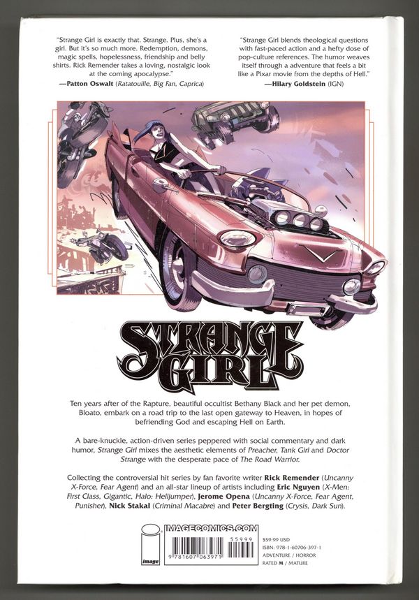Starts Dec 8 1st printing. Collects Strange Girl (2005-2007) #1-18. Written by RICK REMENDER. Art and cover by art ERIC NGUYEN, JEROME OPENA, NICK STAKAL and PETER BERGTING. Cover by ERIC NGUYEN. FOR THE FIRST TIME, IN ONE VOLUME: RICK REMENDER'S CRITICALLY ACCLAIMED INDIE HIT, FROM START TO FINISH! Ten years after the Rapture, a beautiful occultist and her pet demon embark on a road trip to the last open gateway to heaven, in hopes of befriending God and escaping hell on earth. A bare-knuckle, action-driven series, peppered with social commentary and dark humor, STRANGE GIRL is a story about the bewildering nature of religion, what would happen if the dark future predicted by many came true, and what a good person would endure for not having faith in advance of it. Featuring story and art by a handful of today's hottest new talents including RICK REMENDER (Uncanny X-Force, Venom), ERIC NGUYEN (Halo, Sandman), JEROME OPENA (Uncanny X-Force, Punisher) and NICK STAKAL (Criminal Macabre). Hardcover, 8-in. x 11-in., 450 pages, full color. Mature Readers Cover price $59.99. Grade: FN/VF 7.0 explanation of grade Condition: Used (collectible)