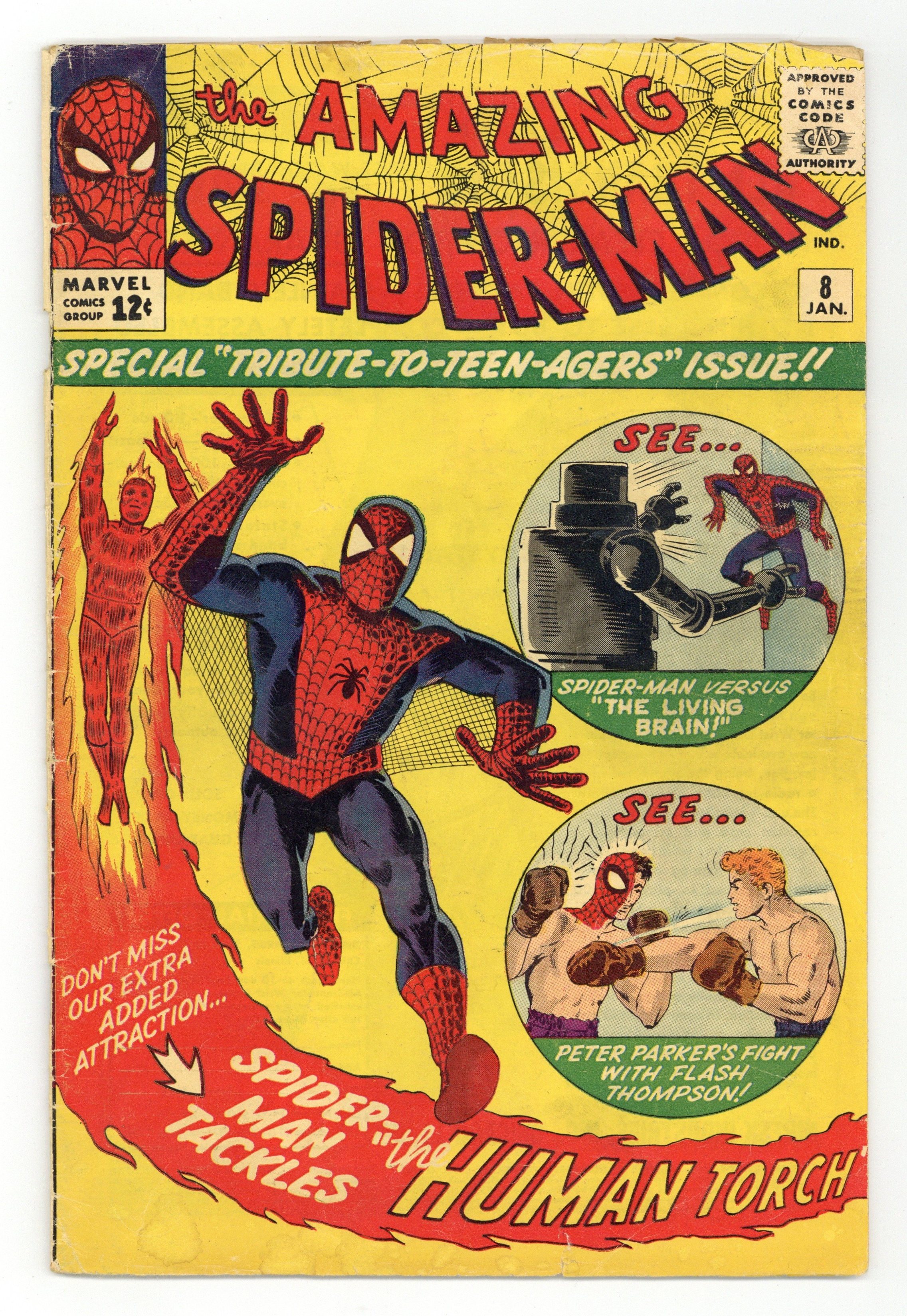 Starts Jan 3 Cover art by Steve Ditko. First appearance of Mr. Petty (inventor of the Living Brain) in The Terrible Threat of the Living Brain!, script by Stan Lee, art by Steve Ditko; When two technicians try to steal a computer that is on display at Peter's school, they accidentally turn it into "The Living Brain" that goes wild and must be stopped by Spider-Man. Reprinted in Marvel Tales # 5 and #145. Spider-Man Tackles The Torch!, script by Stan Lee, pencils by Jack Kirby, inks by Steve Ditko; Spider-Man crashes a party at Johnny Storm's girlfriend's place, causing a fight between the Human Torch and Spider-Man that soon escalates to include the rest of the Fantastic Four. Letter to the editor from Buddy Saunders, president of MyComicShop, written to Marvel in his callow youth. 36 pgs. $0.12. Cover price $0.12. Grade: GD 2.0 explanation of grade Condition: Used (collectible)