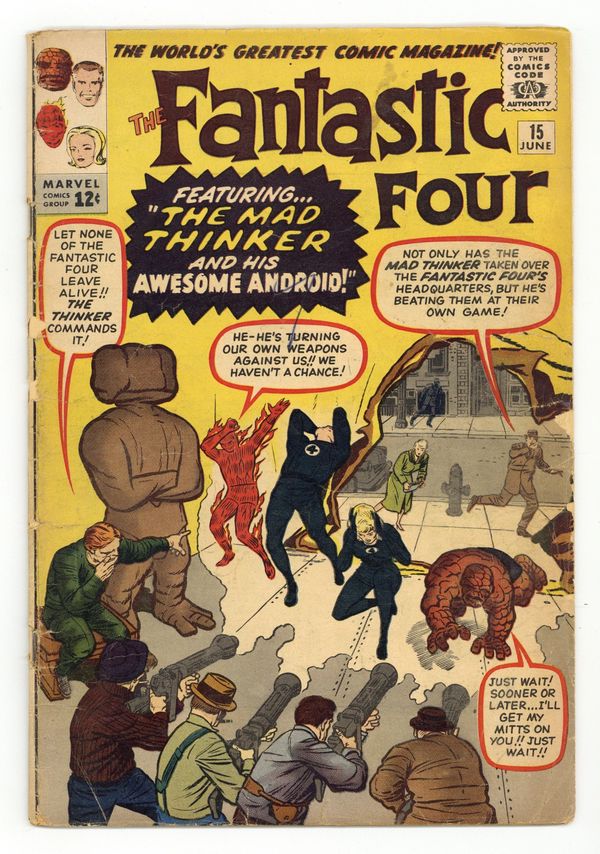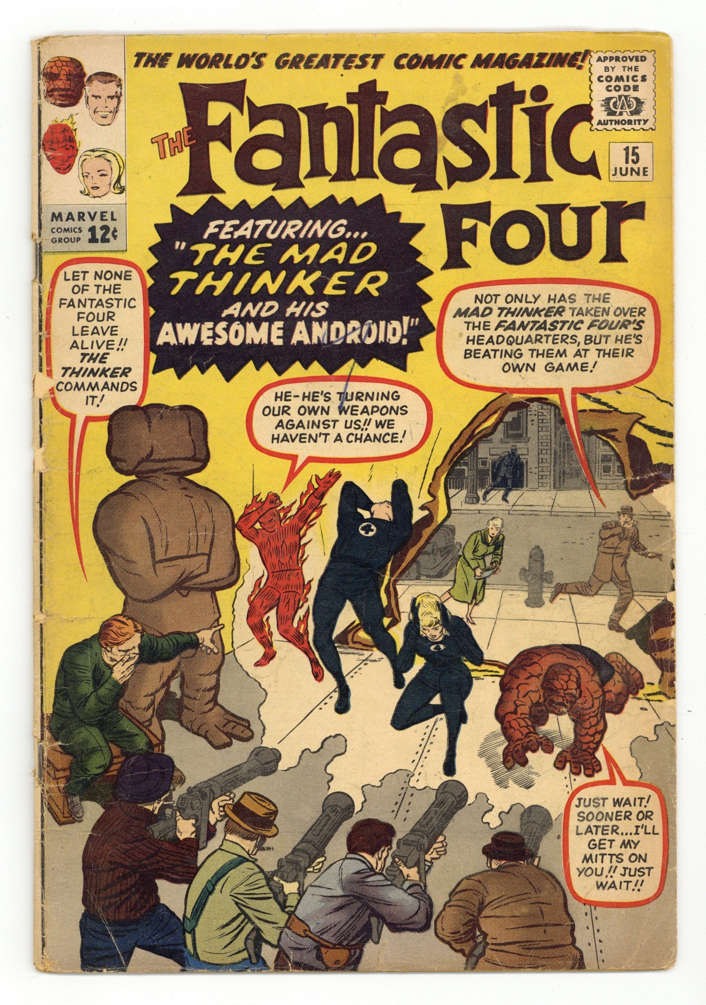 Ended Nov 10 8:06 PM CST Bid History 12 bids Winning Bid $43 Cover pencils by Jack Kirby, inks by Dick Ayers. First appearance of the Mad Thinker in "The Fantastic Four Battle the Mad Thinker and His Awesome Android!", script by Stan Lee, pencils by Jack Kirby, inks by Dick Ayers; The Mad Thinker has summoned gang leaders to try to become the king of New-York; To achieve his goal, he must defeat the Fantastic Four; So he makes sure they are all offered interesting opportunities; While they disband, the Thinker uses the Baxter Building to build his Awesome Android. The Fantastic Four Pin-Up Page, script by Stan Lee, pencils by Jack Kirby, inks by Dick Ayers. Half-page ads for Sgt. Fury # 1 and the next issue of Fantastic Four. Fantastic Four Fan Clubs ad. 36 pgs. $0.12. Cover price $0.12. Grade: PR 0.5 explanation of grade Condition: Used (collectible)