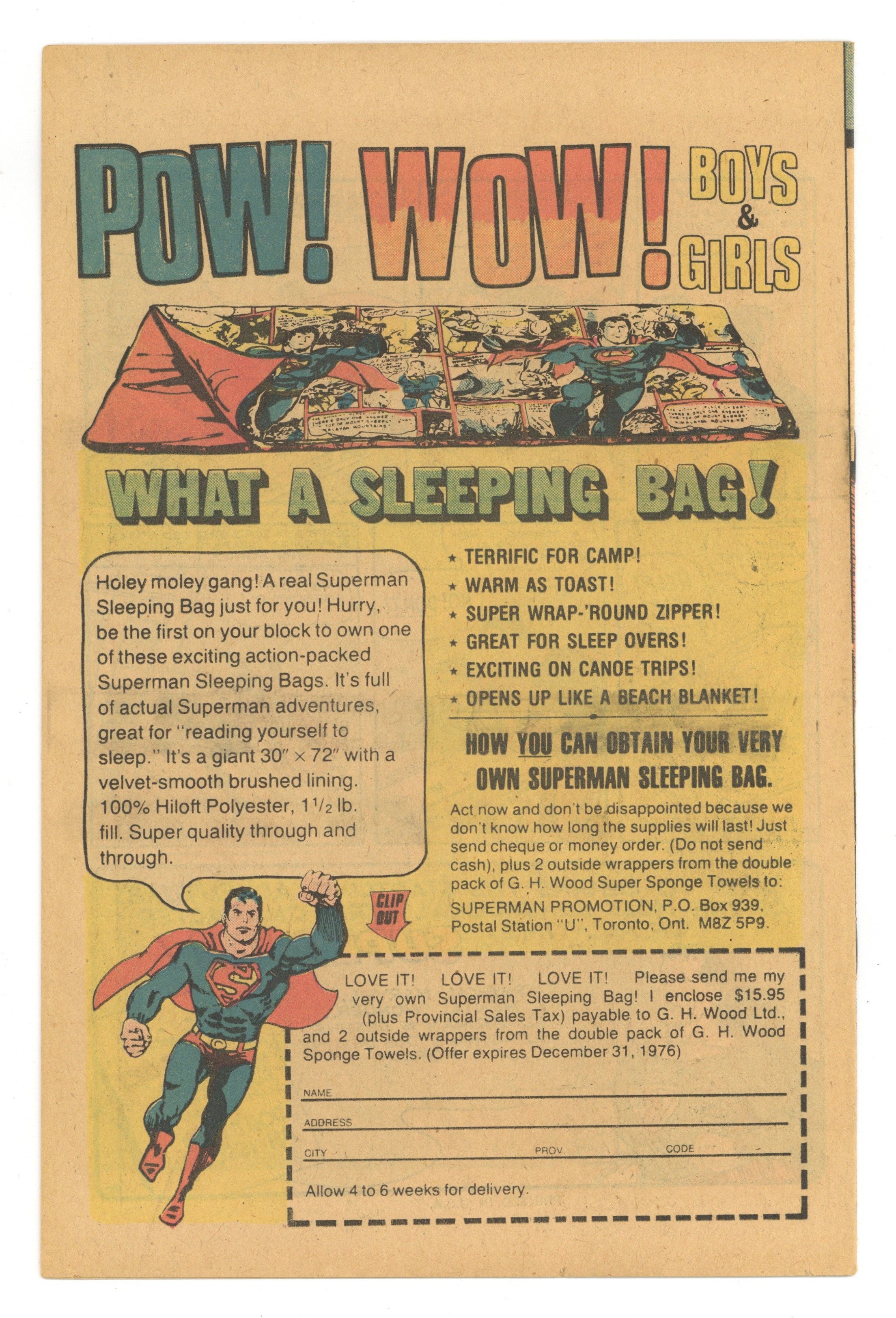 16-page reprint of complete Superman story from Action Comics #1 with Sleeping Bag ad on the back cover. 1976 reprint, 10 cent cover price. Paper cover. Cover price $0.10. Grade: FN 6.0 explanation of grade Condition: Used (collectible)
