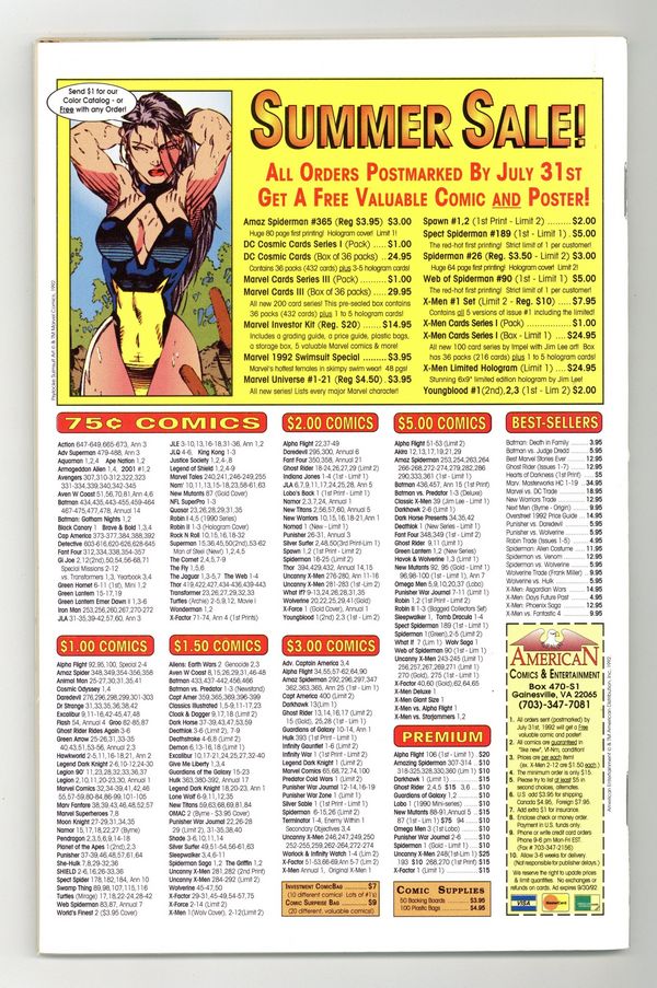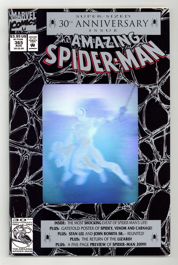 Starts Dec 8 Direct Edition. 80-page giant 30th Anniversary issue, with the first appearance of Spider-Man 2099! The Lizard returns in "Fathers and Sins." Script by David Michelinie, pencils by Mark Bagley, inks by Randy Emberlin. J. Jonah Jameson is featured in "How I Created Spider-Man!" Script by David Michelinie, art by Aaron Lopresti. Gwen Stacy takes center stage in "I Remember Gwen." Script by Stan Lee, plot by Tom DeFalco, art by John Romita Sr. (Cameos by the Green Goblin and Doctor Octopus.) The Prowler is also here in "A Friend in Need." Script by Tom DeFalco, pencils by Tod Smith, inks by Andrew Pepoy. There are also two text pieces, "The Saga of Spidey's Parents" by Stan Lee, and "Spider-Man: The First Thirty Years" by Peter Sanderson. Spider-Man 2099 gets a sneak preview, with a script by Peter David, pencils by Rick Leonardi, and inks by Al Williamson. This issue was originally released with a fold-out poster of Spidey versus Venom and Carnage (poster may be missing in lower grades). 84 pgs. Cover price $3.95. Grade: VF+ 8.5 explanation of grade Condition: Used (collectible)