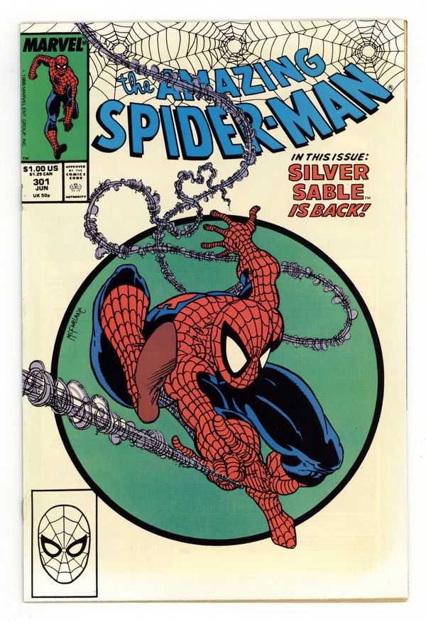 Ended Nov 10 2025 Bid History 12 bids Winning Bid $75 Direct Edition. "The Sable Gauntlet!" Guest-starring Silver Sable. Script by David Michelinie. Art by Todd McFarlane. Cover by Todd McFarlane. The first 300 issues of the Amazing Spider-Man are in the books after the web-slinger's epic battle vs. Venom last issue! And now the next chapter in the wall-crawler's anthology begins with an encounter with his favorite mercenary: Silver Sable! The enchanting sable agrees to make a test run through the security systems of a new high-rise office building, but deadly danger awaits on the top floor! Will Spidey catch the elevator in time? Cameo appearances by Mary Jane Watson and Dr. Morris Sloan. First $1.00 issue. (Notes: The cover is the same artwork (with different colors) as the cover to issue 300. This issue includes a full-page ad for the first appearance of Typhoid Mary in the Daredevil (1st) series -- art by John Romita Jr. and Al Williamson. The letters page contains a statement of ownership: average print run 469,913; average paid circulation 284,692. 36 pgs. Cover price $1.00. Grade: FN/VF 7.0 explanation of grade Condition: Used (collectible)