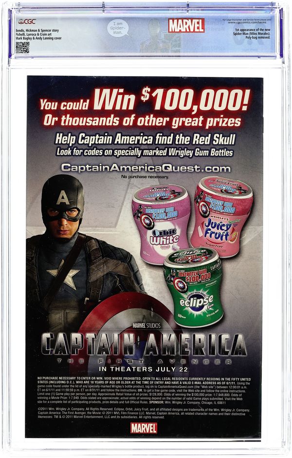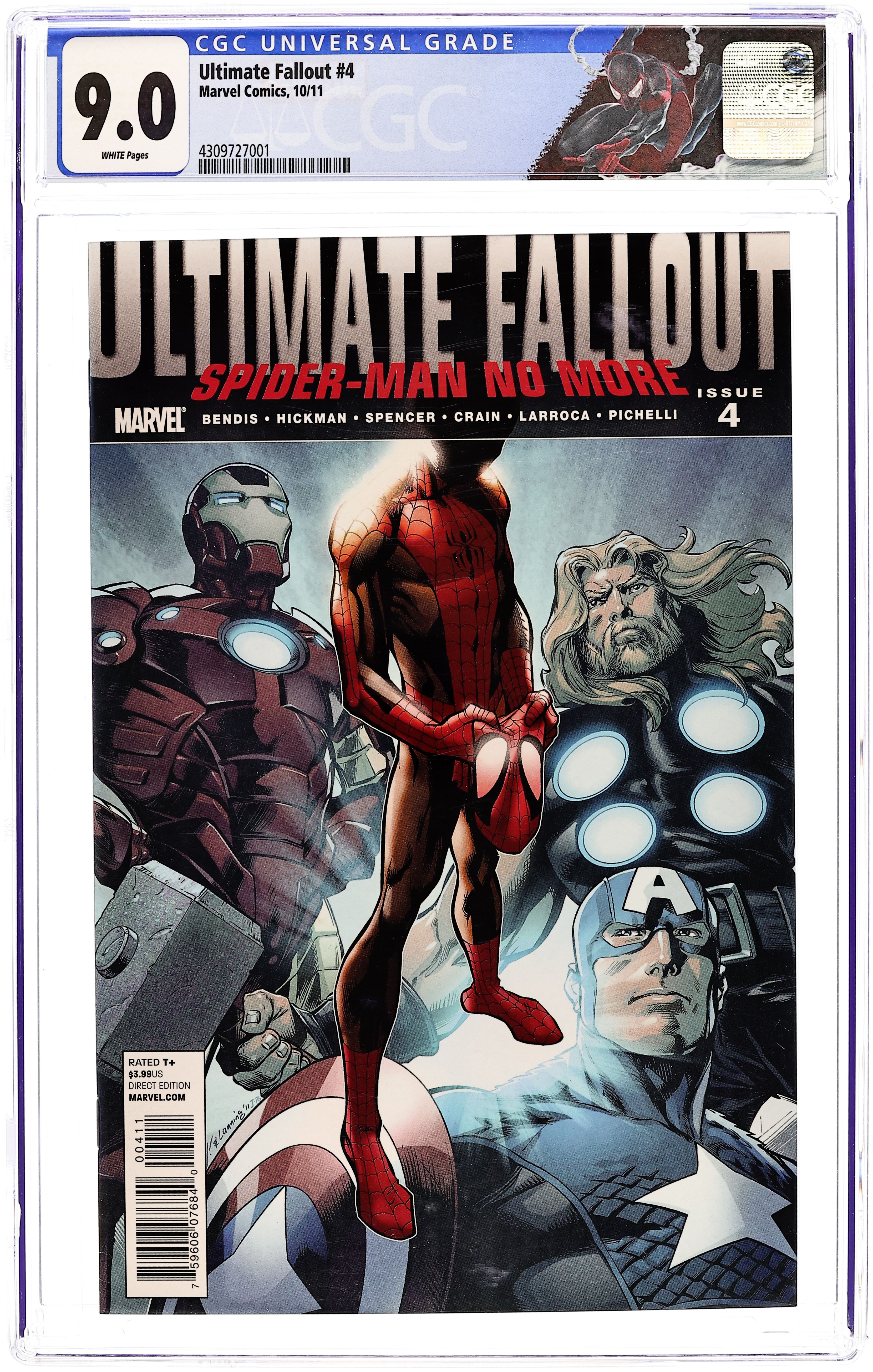 Direct Edition. 1st appearance of Miles Morales. Written by BRIAN BENDIS, JONATHAN HICKMAN & NICK SPENCER. Art by SARA PICHELLI, SALVADOR LARROCA & CLAYTON CRAIN. Cover by MARK BAGLEY. What will become of Captain America? Where have all the X-Men gone? And what is up with the new Spider-Man suit? Don't miss the final chapters of one of the most talked about Ultimate events ever. 36 PGS. (each)/Rated T+...$3.99 (each) Cover price $3.99. Grade: CGC 9.0 explanation of grade Condition: Used (collectible)
