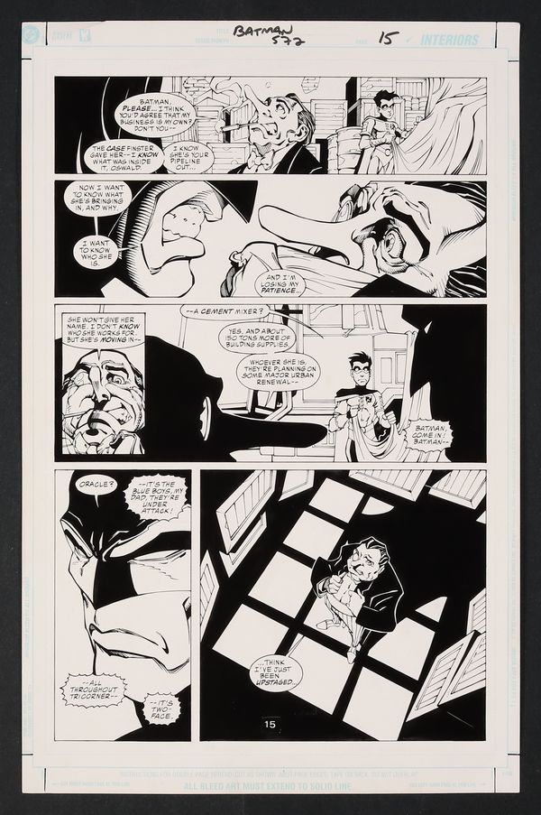A classic Gotham scenario with a new sense of urgency! Batman and Robin grill the Penguin over his meeting with a mysterious woman- who seems to want to move quite a bit of construction equipment into No Man's Land! As if roving gangs led by various rogues, famine, and continuously crumbling infrastructure weren't enough now Batman has to worry about shady real estate developers! Pencil and ink on DC Comics art board. 11 1/4" X 17".