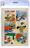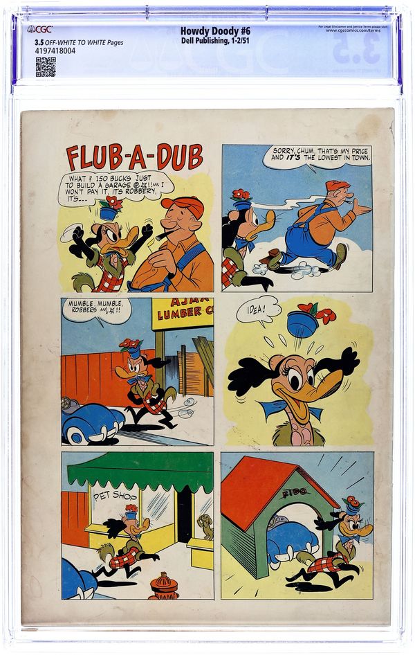 An icon of 1950s Americana, Howdy Doody was a star of early television, and a mischievous Tom Sawyer-type adventurer in this comic. Howdy and Dilly set out to win the prize for capturing the most unusual creature. Howdy and Dilly encounter aliens in a flying cup and saucer, leading to a madcap chase with a group of scientists. The Inspector thinks Phineas T. Bluster was swindled when he bought an old diamond mine. This comic was mentioned in the text of the anti-comics classic Seduction of the Innocent on page 309. Clarabell; Howdy Doody; Howdy's Puzzle Page; Dilly Dally; Howdy Doody and the Jolly Stranger; The Inspector and the Wickys; Flub-a-Dub. 48 pages, Full Color. Cover price $0.10. Grade: CGC 3.5 explanation of grade Condition: Used (collectible)