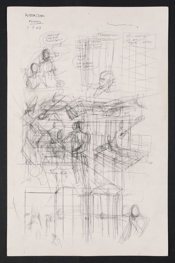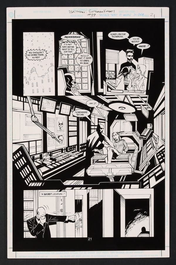 Story threads continue to converge on this page as Alfred hides an illness and Robin collects Leslie Thompkins to help treat Huntress who the Dynamic Duo have just rescued (after accidentally hitting her with the Batcycle). All the while, Checkmate's plans are set into motion as they've been tracking Huntress since she 'escaped' from their offices. Pencil and ink on DC Comics art board. 11 1/4" X 17".