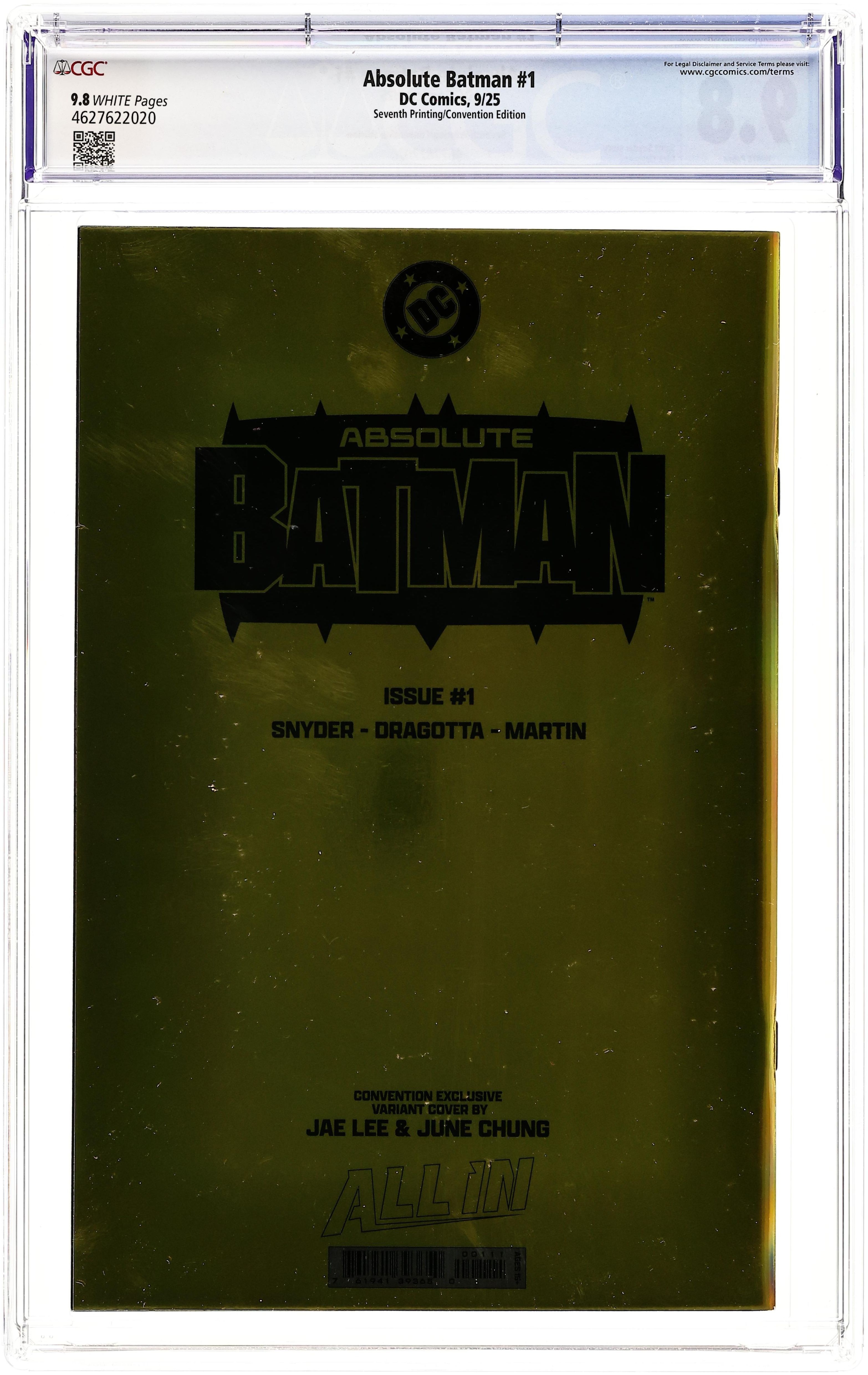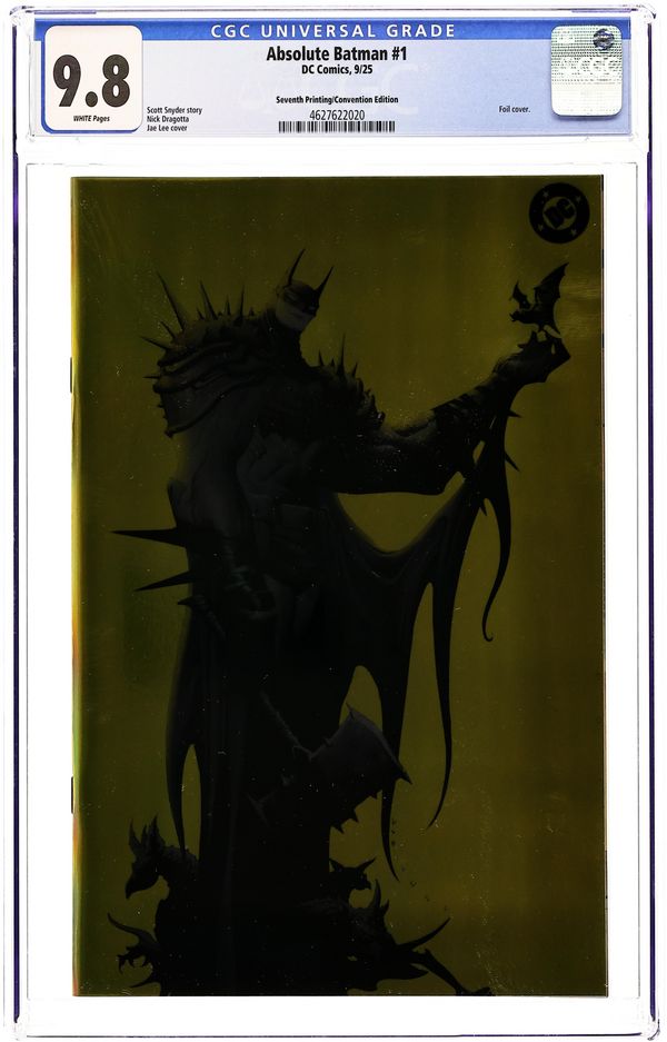 Ended Oct 17 2025 Bid History 19 bids Winning Bid $64 7th Printing. Convention Exclusive Foil Edition Virgin Cover by Jae Lee and June Chung. Written by Scott Snyder. Art by Nick Dragotta. BATMAN LEGEND SCOTT SNYDER AND ICONIC ARTIST NICK DRAGOTTA TRANSFORM THE DARK KNIGHT'S TALE FOR THE MODERN AGE! Without the mansion...without the money...without the butler...what's left is the Absolute Dark Knight! 48 pages, full color. Rated T+ Grade: CGC 9.8 explanation of grade Condition: Used (collectible) unless item is a new release